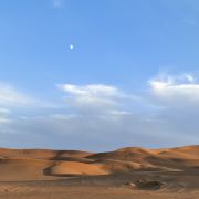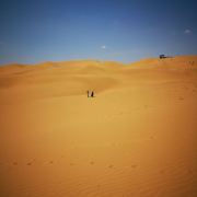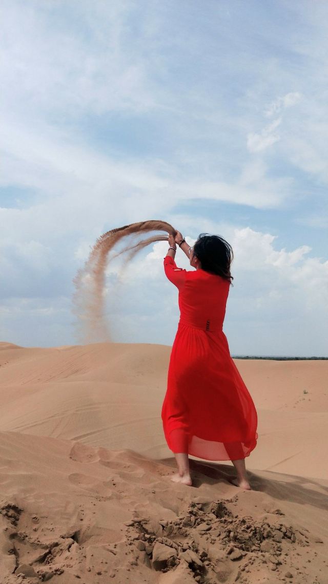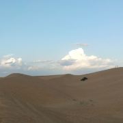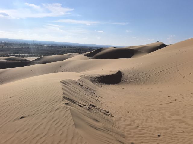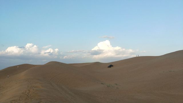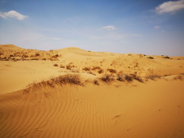 纵深进入沙海,如入无人之境,又像身处火星,不管你凝视远方还是对着天空发一天的呆,绝对没有一丝喧闹打扰你。沙丘起起伏伏,既纷乱繁杂,又个个如鼓胀的饺子排列规律秩序。你怎么看都会随你的心境生出万千感慨延绵不绝变化万端。