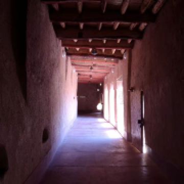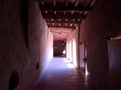 此地房屋的建造和国内的干打垒一样,先用草秸和着粘土夯实成大砖块,垒搭成墙。再在上面铺上棕榈树干的梁和芦苇杆铺成的椽子,最后铺上粘土和石灰石的屋顶(Lime Chalk)。在炎热的沙漠里,厚厚的墙壁隔开了外面的酷热。走在过道里,凉风飕飕的。
