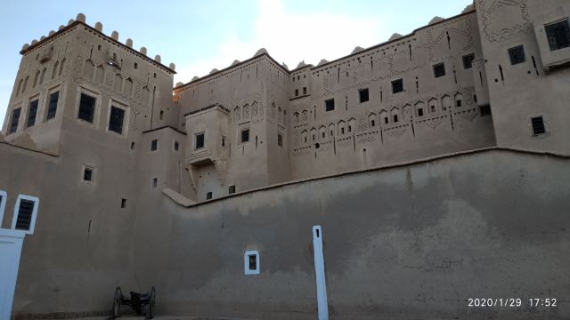 城堡以当地特有的赤土泥砖建造,高高的围墙,小小的窗户,外观显得古朴而又宏伟,展示了传统的柏柏尔建筑风格。在海湾三国旅行时,也参观过一些城堡,建筑用料与色彩与它相似。总的说来,北非和中东的古代城堡,与在欧洲见过的城堡,风格差异较大。