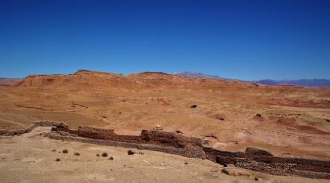从马拉喀什到Ouarzazate要翻越阿特拉斯山,盘山公路一路转上坡去。老司机把车开得很快,接近十二点时,到了第一站Ait ben Haddou。