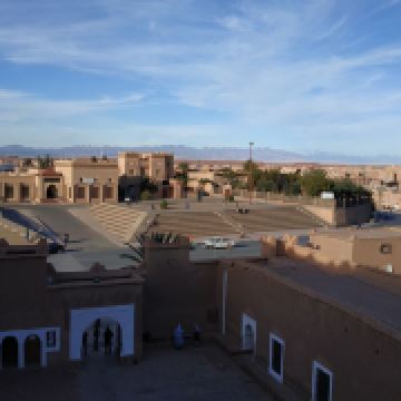 城堡对面是一座宽阔的高台,我们走上去观景。此时的瓦尔扎扎特显得宁静而美丽。在广阔的天空下,远处的阿特拉斯山脉和近处的古代城堡,呈现出一幅北非的独特风景图画。