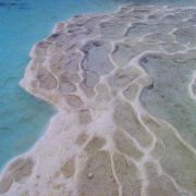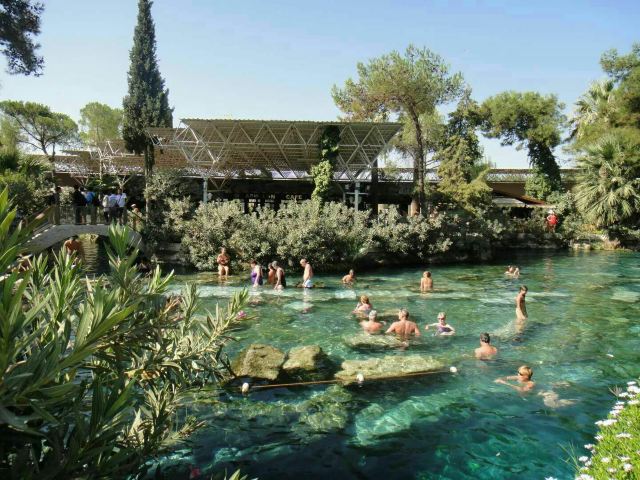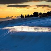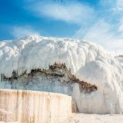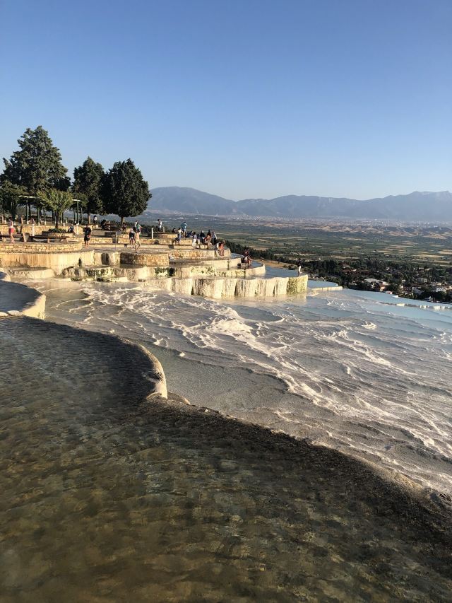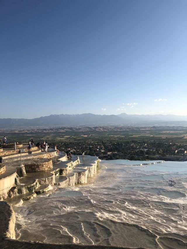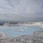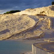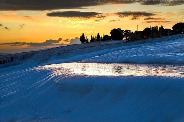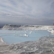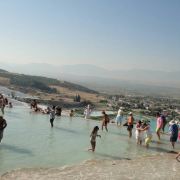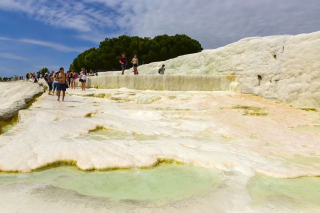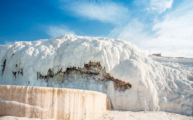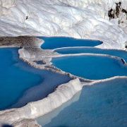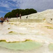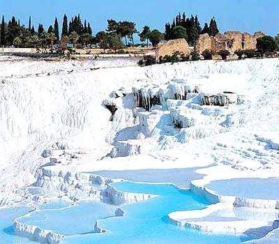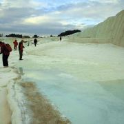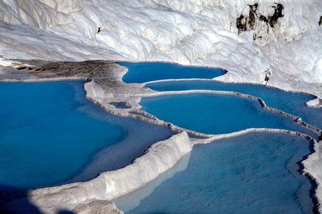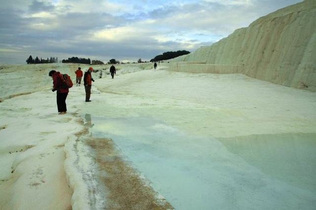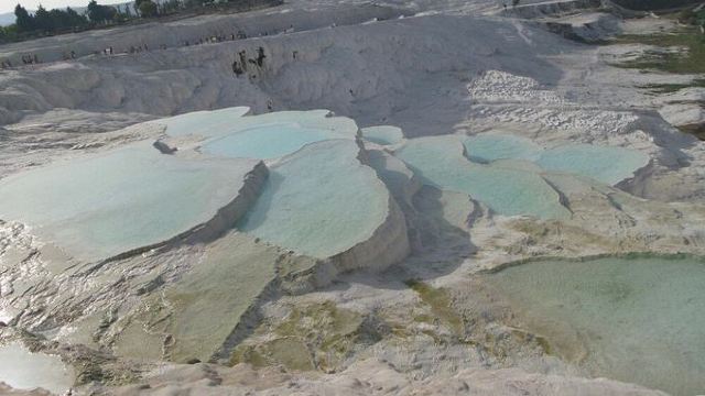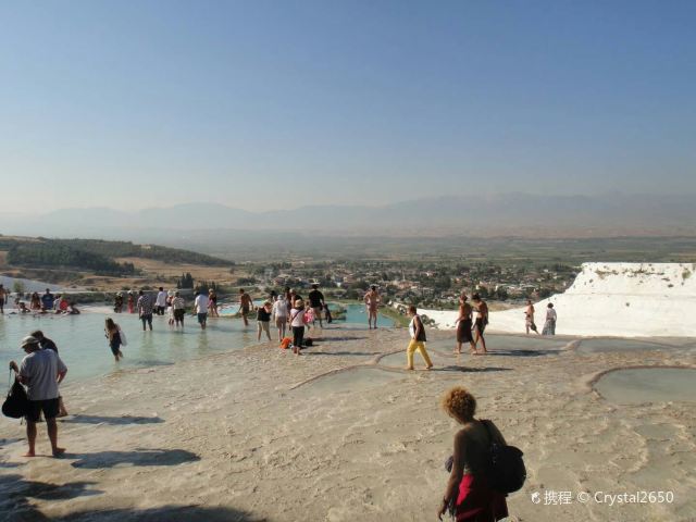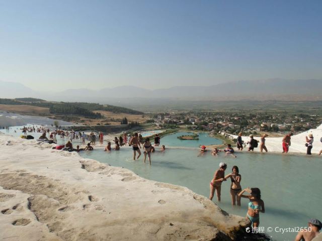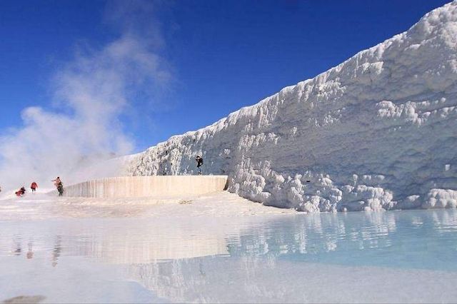 进入棉花堡温泉池要先赤脚行进250米才能到达上方平台,玉一样的半圆形白色天然阶梯层层叠叠,犹如雪砌的梯田,远看像大朵大朵的棉花矗立在山丘上,无数涓涓细流从丘岩间的缝隙潺潺流下,温热的水蒸气让棉花堡氤氲在淡淡的缥缈雾气里,泉水积在台阶之间,形成一汪汪波澜不兴的水池,这便是有世界七大奇观之誉的土耳其棉花堡。从远古起,土耳其温泉就闻名于世。