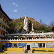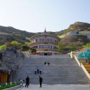 游完观音洞风景区后往景区上院方向走,会经过情人园、元辰殿,殿内供奉着61尊天尊神像。再往里走就到了景区的主体建筑群,首先看到宏伟的天王殿和两侧的钟鼓楼。后面坐落着25米高的滴水观音,是辽西的露天大佛,外形庄严神圣,往里走到最后是景区上院的大雄宝殿。此外,寺中还有很多偏殿建筑,其中法宝楼里珍藏了来自国内外名山古刹的大德高僧赠送的纪念品数十件。