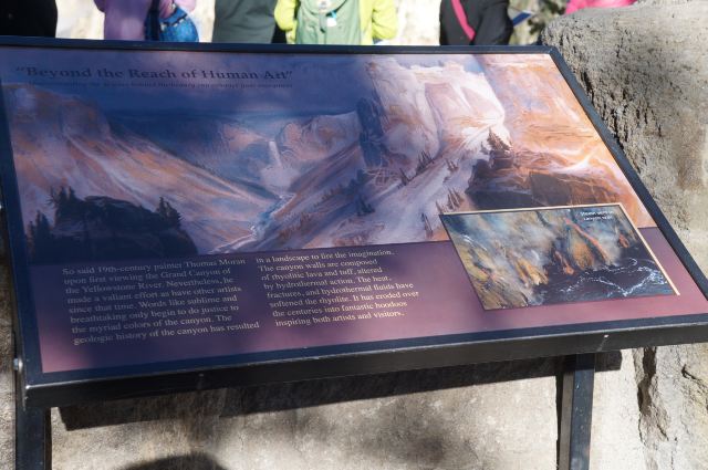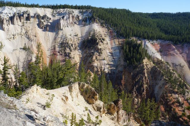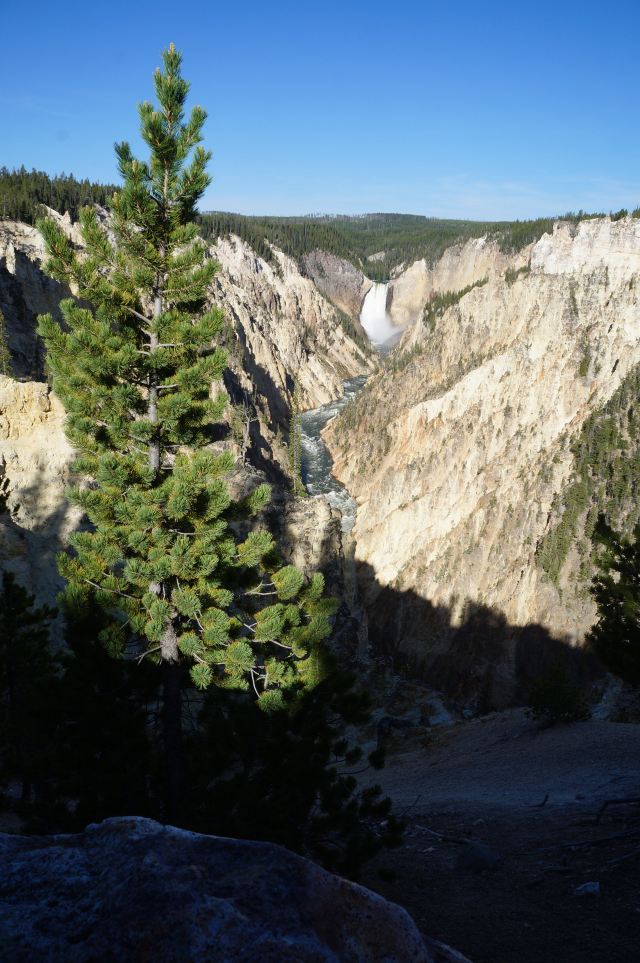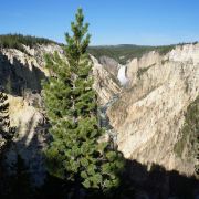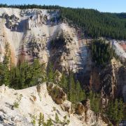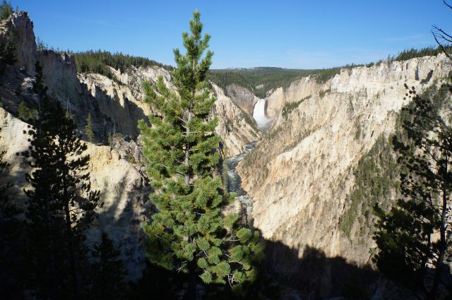 黄石公园非常有名的景观之一,可以同时观赏壮观深邃的峡谷和飞流直下的瀑布,天气好,会看到一道彩虹横跨峡谷。黄石大峡谷有两个瀑布,Upper Fall上瀑布和Lower Fall下瀑布,下瀑布的落差更大,也更壮观,Artist Point是拍摄下瀑布的好位置。长期的河水冲刷形成了色彩瑰丽的岩壁,呈现出黄、橙、棕、褐等,印第安人称之为“黄石”。