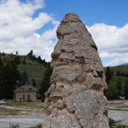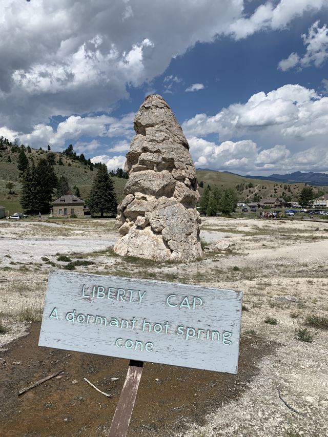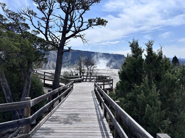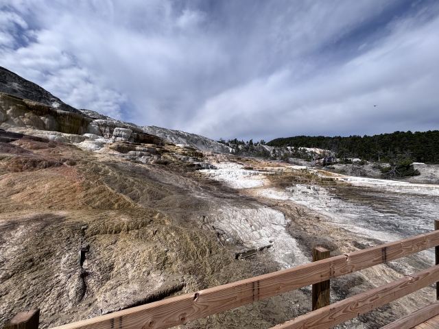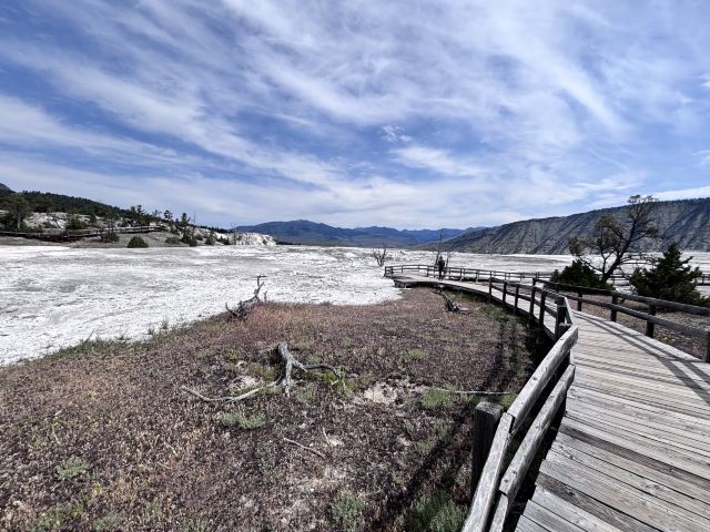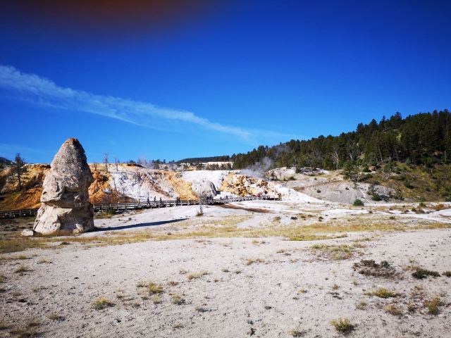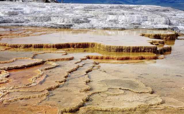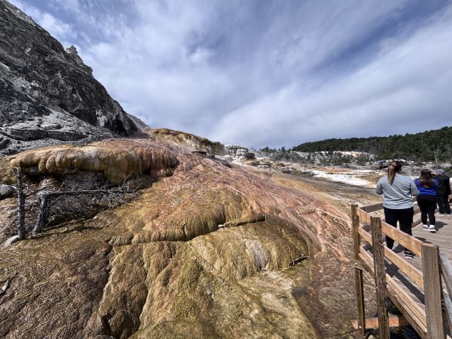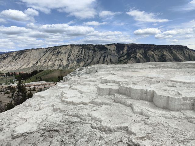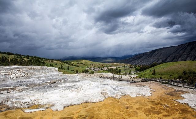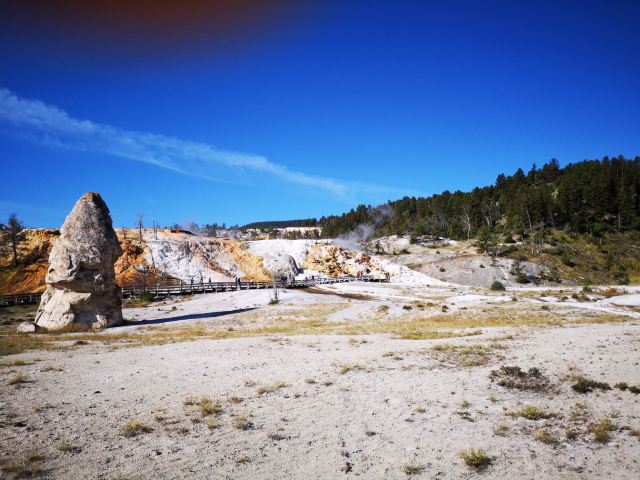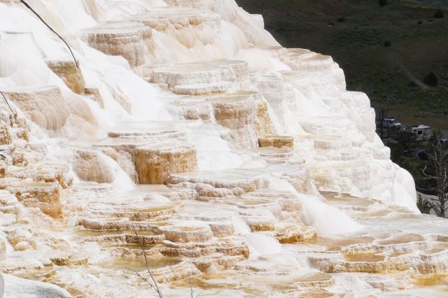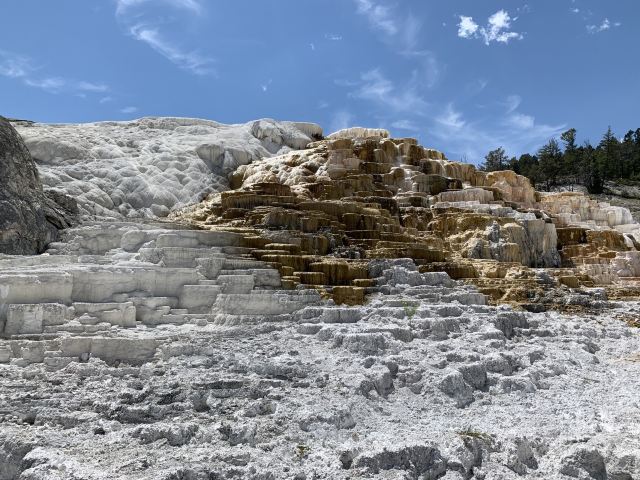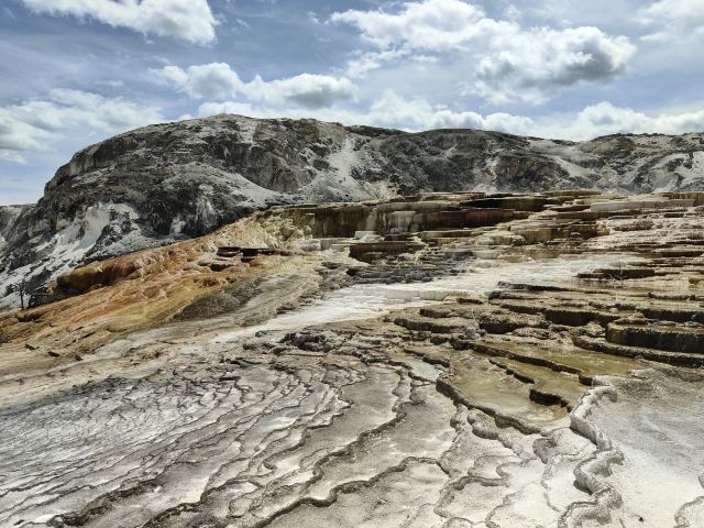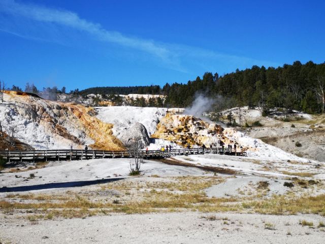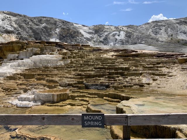 猛犸温泉位于黄石国家公园西北,是世界上已探明的较大的碳酸盐沉积温泉。黄石公园管理局总部在此,各种配套服务设施也比较齐全。景观以石灰石台阶为主,也称热台阶区,可分为上台地(Upper Terraces)和下台地(Lower Terraces),这里曾经色彩丰富,但现在大部分温泉已经干涸,导致大量微生物死亡,同时也失去了颜色,残留在乾枯了的大台阶上,形成了奇特的地貌。