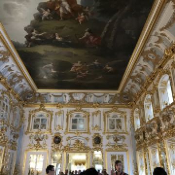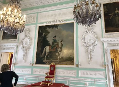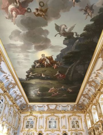 在大瀑布喷泉的后面就是彼得霍夫宫的大宫殿,内外装饰很华丽,两翼均有镀金穹顶,宫内有庆典厅堂、礼宴厅堂和宫室。当时彼得大帝住一楼,叶卡捷琳娜皇后住二楼,楼上装饰很华丽,舞厅的圆柱之间,都以威尼斯的镜子作装饰。宫殿里面不让拍照,整体规模比叶卡捷琳娜宫和冬宫要小很多,装饰格调也非常类似,加上要额外收取费用,因此很多团队游客并不进入里面参观,而是把时间多放在下花园里。