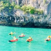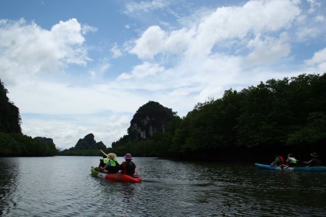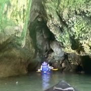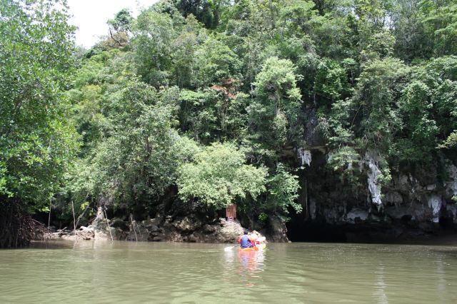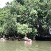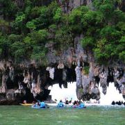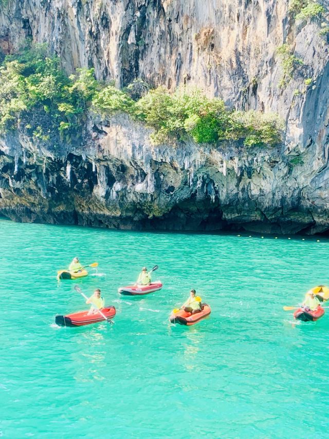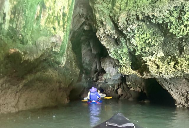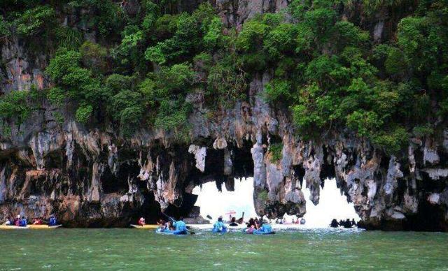 这些岛上有很多笔直的悬崖,在落潮的时候,人们可以进入一些岛屿的洞穴、探寻隐秘的环礁湖。受欢迎的山洞有蝙蝠洞、红树洞、钻石洞及房间洞等。可以在山洞门口换乘小皮艇,两人一艘皮艇,由船员划桨带您进入,每个山洞的形态不同,有的宽阔,有的狭窄到要躺在皮艇内才能穿过。