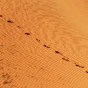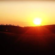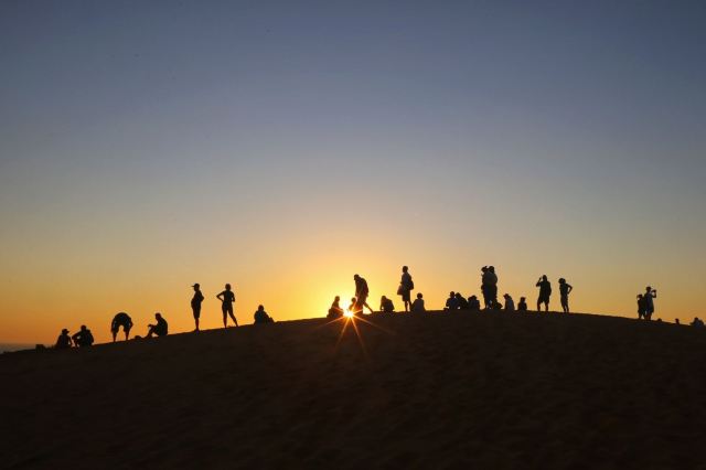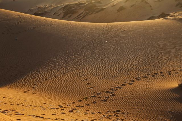 红沙丘是观赏夕阳的好位置,挑一个高处坐下,看着夕阳渐渐地西沉,映红了半个天际,紫色的晚霞与棕红色的沙丘在落日余晖的笼罩下显得更加艳丽,整个气氛十分浪漫。