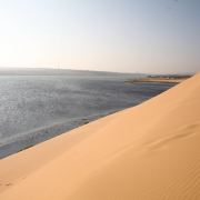 沙漠的深处有淡水湖泊,湖泊旁长满了高大幽深的热带丛林植被。红白相间的沙丘包裹着碧湖绿树,湖上飘着朵朵荷花,风吹荷浪翻涌,岸边丛林树梢沙沙作响,沙粒流动无痕。一副那么不和谐却又那么真实的美景在面前,使人有着无法形容的激动。