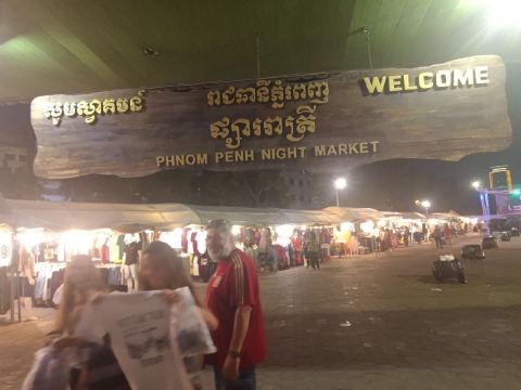 金边夜市坐落在洞里萨河边,主营日用品和旅游纪念品,当地人很多,是晚上消磨时光的好去处。夜市由街心花园改建,原来草地改成了水泥砖地坪,面积约有四、五千平方米,四周有铁管栏杆围着。沿街一边开了两个口子,一头进,一头出,进出还算有序。内设统一规格的彩色商棚多排,商品种类繁多。有服装、鞋帽、花卉、食品、手饰、化妆品、日用品,还有数量众多的石雕、竹木制品以及高棉特色的佛像饰品等工艺品,可谓琳琅满目了。