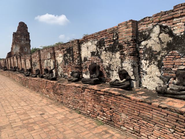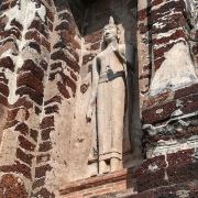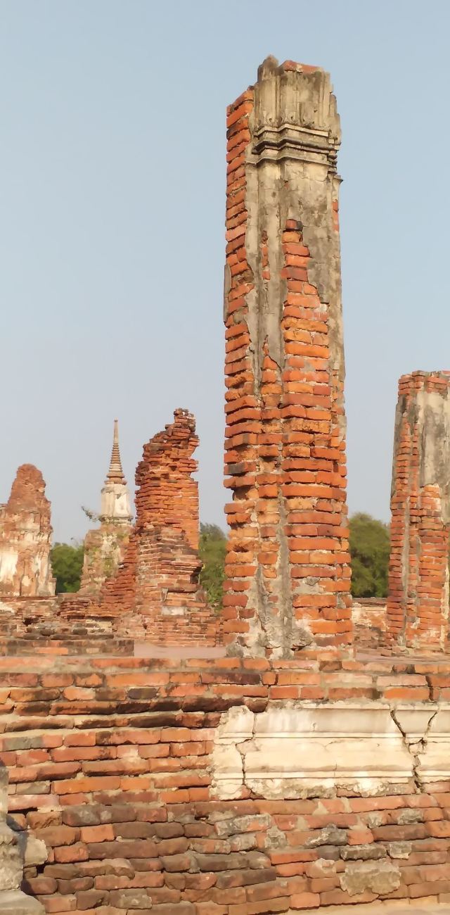 玛哈泰寺的主塔是高棉式的佛塔,曾经倒塌又重建,寺内到处可见断垣残壁和被洗劫破坏后的痕迹,很多佛塔现在只剩下底部的基座,从围绕四周的佛塔上依稀可以看到当时以灰泥装饰的痕迹。现在还能看到很多被缅甸军队破坏的佛像,这样的残缺不全反而看起来比完整更有味道。这里的古迹有着辉煌的历史,14世纪受高棉天授神权思想及古老婆罗门教教义影响,建构雄伟万千的佛寺、皇宫,而今时代变迁,所残留的历史古迹彷佛正幽幽的诉说着昔日耐人寻味的繁华过往,让您细细品味追古溯今和穿梭时空的美。