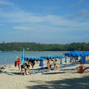 海滩靠中心的位置有一片公共区域供游人休息和戏水,多数都是老外。海滩上有很多公用的沙滩椅和阳伞,你可以看到很多老外在冲浪,打沙滩排球、玩水上摩托艇或者空中拖伞。