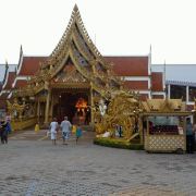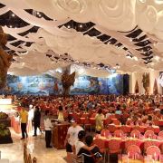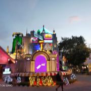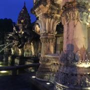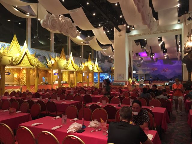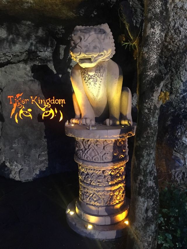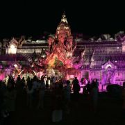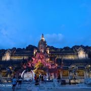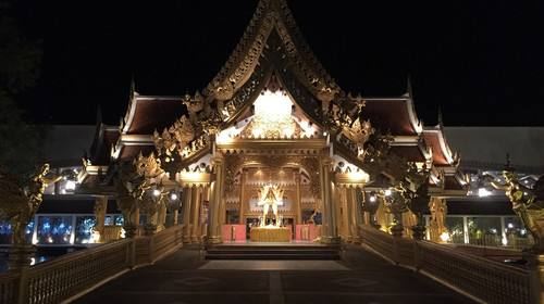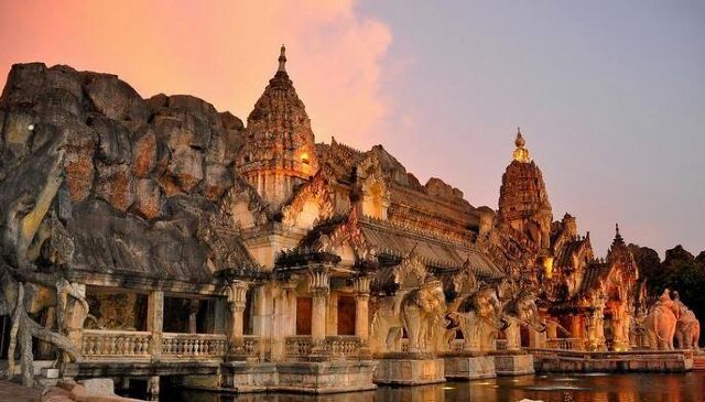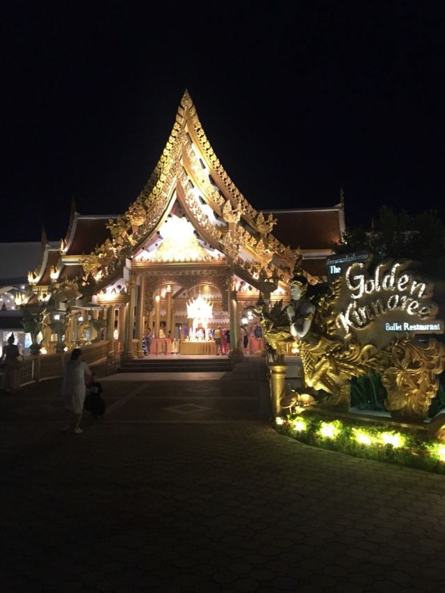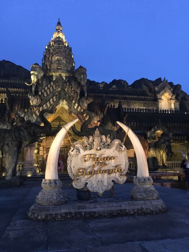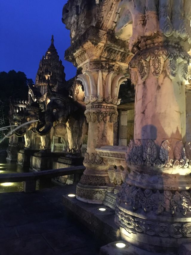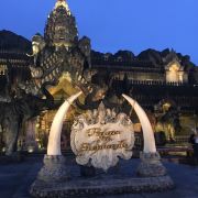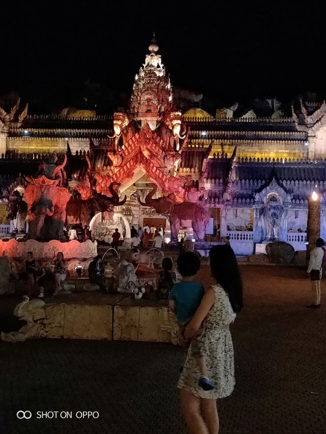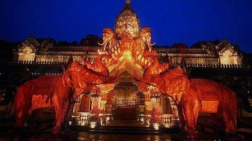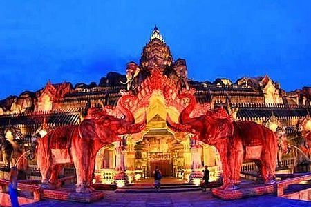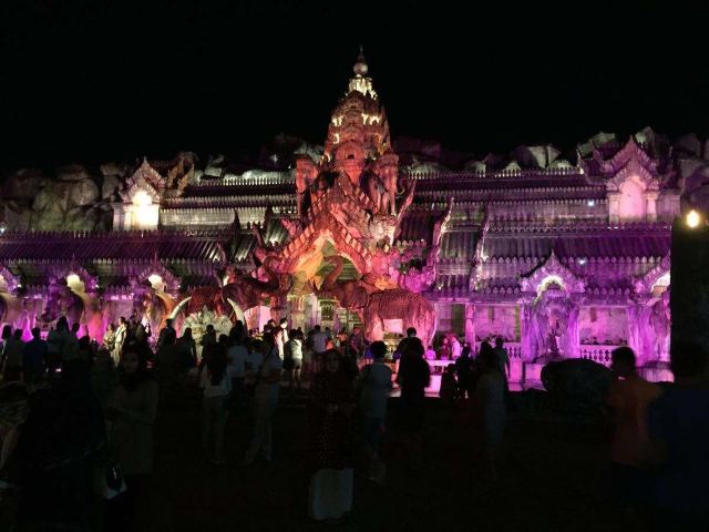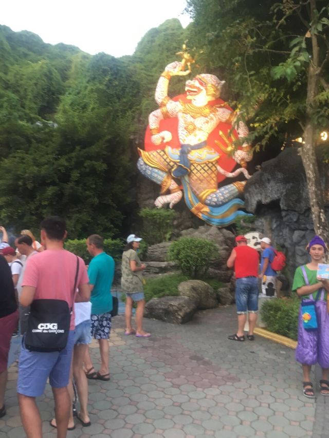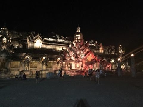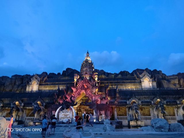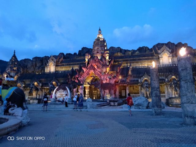 3分 不错去之前很大期待,到了那地方无尽失望。被车颠了一个小时到达目的地。看了外景,以为是游乐和宗教文化结合的景区。进去才知道不是,纯商业,赤裸裸商业,而且是很low那种。一进门各种中国90年代那种手工艺小商品摊位,有一个摊位是专门做用金粉制作的世界著名足球队队徽,其中为了招揽中国游客,在显著位置放了恒大和国安。门口小酒吧的厕所很有意思,第一次进去很瘆人,每个小便位,都有一个牛头瞪着两个点灯的眼睛瞪着你尿尿,洗手台也是一个牛头,一拧开水龙头,水从牛鼻子里流出来。乐园唯一有点看头的是门口的tiger kingdom,类似国内景区的迷宫,通过灯光效果打造的一个室内奇幻场景,最后给你看睡着的白老虎。其他项目基本上都是商店性质,不管外面打造的如何金碧辉煌,进去对不起,都是卖东西的…毫无娱乐休闲场所。就是这么直接。唯一一个娱乐的就是类似咱们国内的那种投飞镖,篮球机这种收费娱乐。谁来泰国玩这个啊。观看晚上歌舞表演前,由于含了自助餐厅,去吃饭,被震撼了,巨牛掰的外观和内饰装修,但是和饭菜严重不匹配。最后说到表演,唯一亮点可能是大象和老虎吧。但这些动物太可怜了,只要花钱就任人肆意支配。表演的时候手机照相机要被上交,工作人员代为收藏,表演结束回去取。表演全程不能录像,说实话也没啥可录的,可能我是不太懂欣赏。