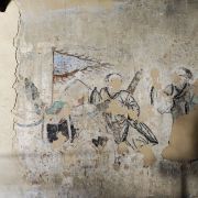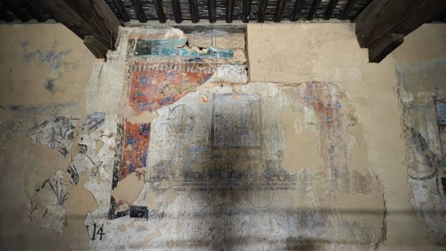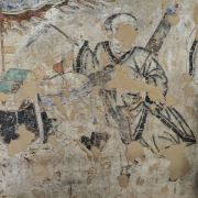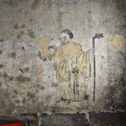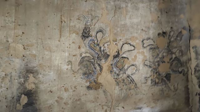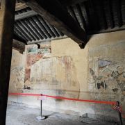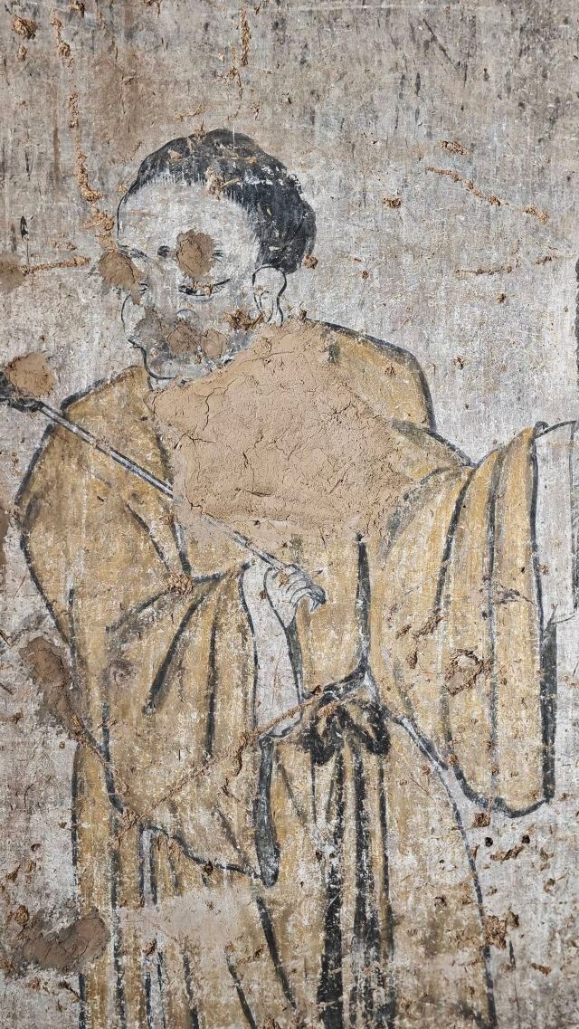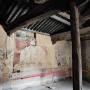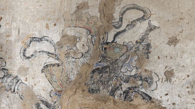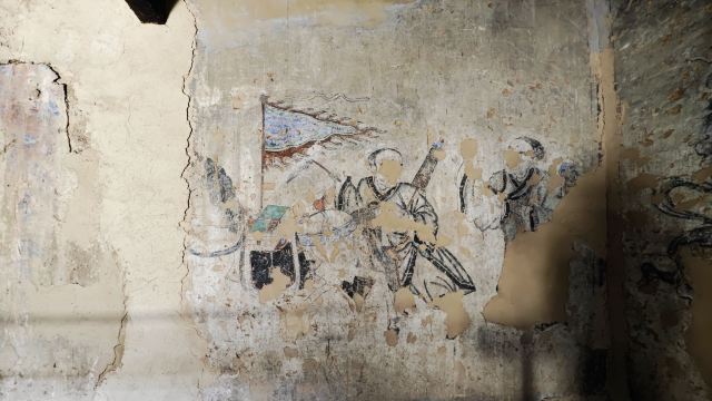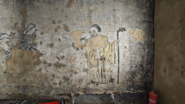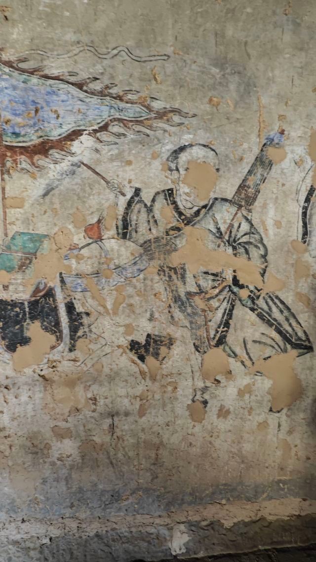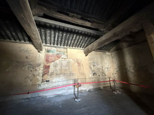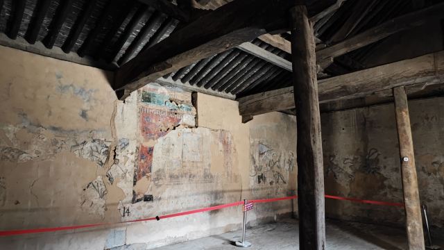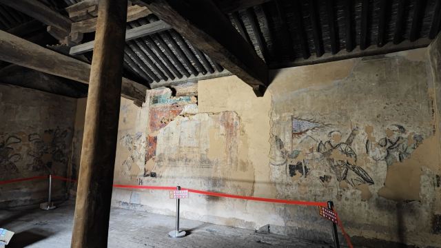 殿内存清代工笔淡彩壁画54平方米,内容为《西游记》人物和四大天王等,正面绘猪八戒担西天经等。东山墙上自南至北依次绘有:左手拄