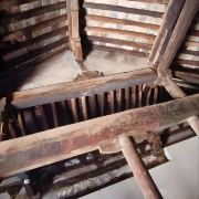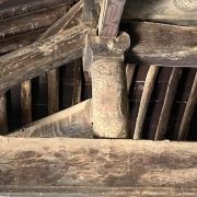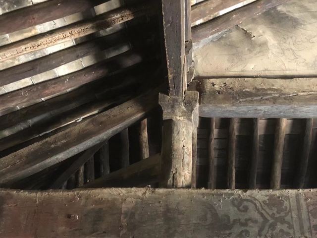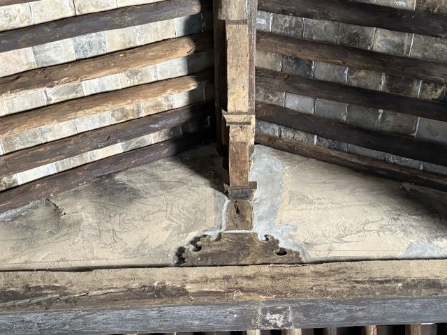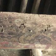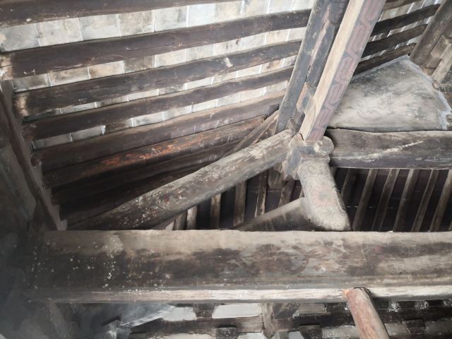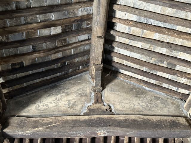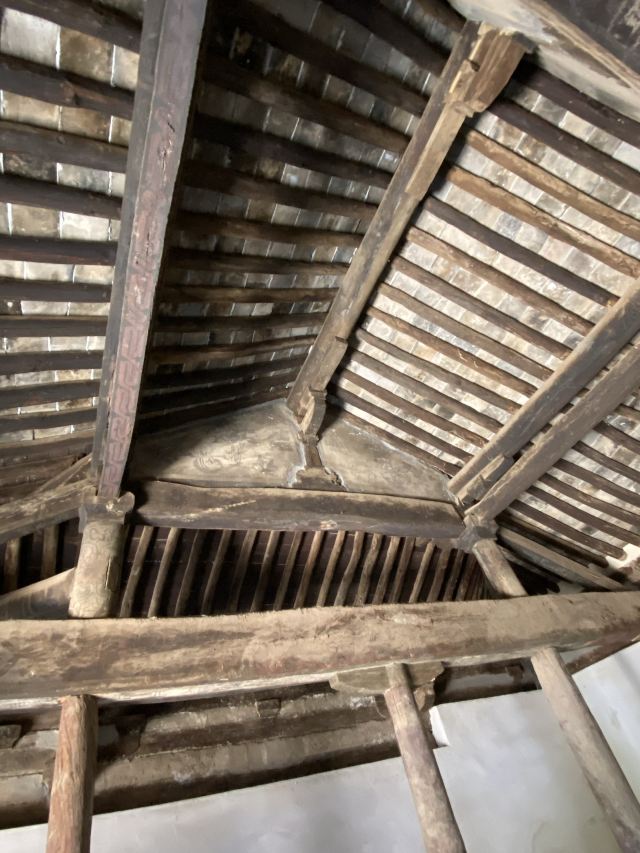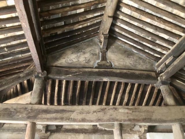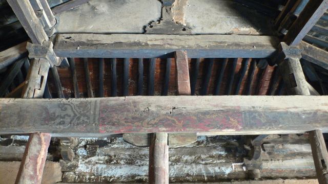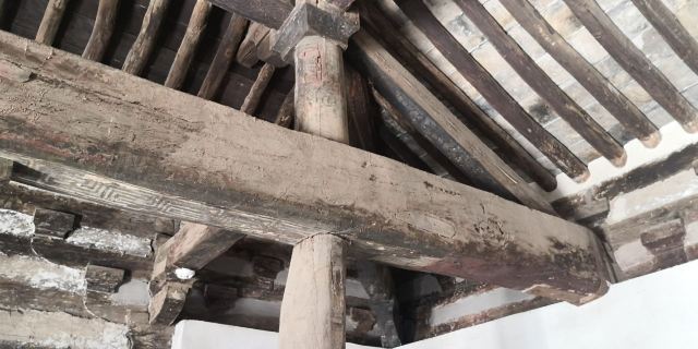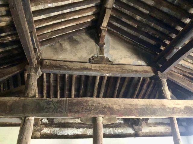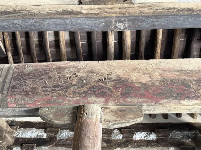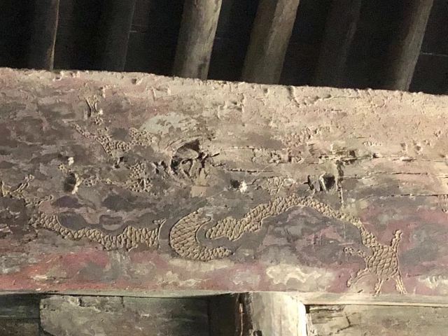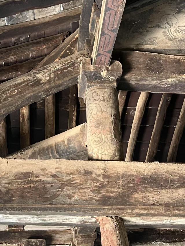 走进殿内,宽敞开阔,竟不设一柱。梁架结构简练精巧,构件相交严实,彰显古代工匠精湛技艺与严谨态度。四椽栿上残存的金黄色五爪龙彩绘,虽色彩剥落,但纹路依然精致,透露出往昔的华丽。