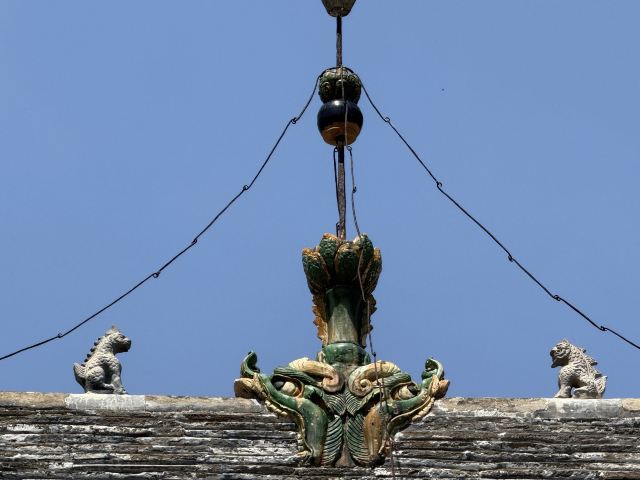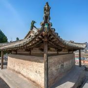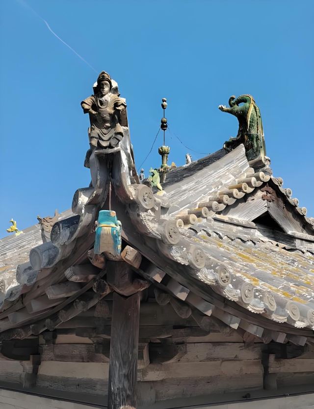 环绕殿身的12根檐柱,柱高小于间宽,恰到好处地撑起建筑。覆盆式柱础简单稳重,柱头卷杀平缓,单杪四铺作斗栱有序排列,稳稳托起深远的屋檐。单檐歇山顶让天台庵檐出深远、起翘明显,如同《诗经》中“如鸟斯革,如翚斯飞”描绘的那般,似一只即将展翅的神鸟,灵动非凡。正脊的灰筒瓦与元代琉璃鸱吻相互映衬,不同时代的建筑元素碰撞出别样火花。
