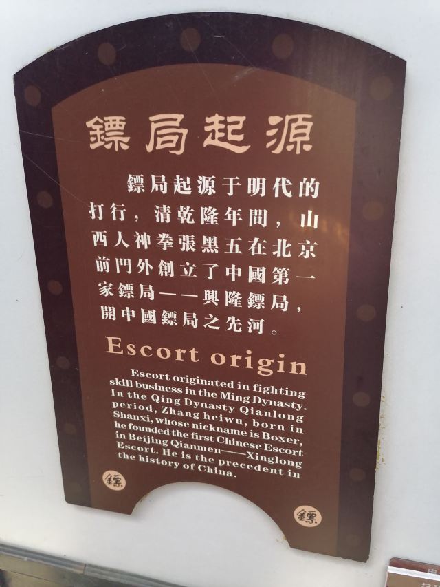 中国镖局博物馆有10大展室,以详实、丰富的实物资料,全面地讲述了镖局这一特殊行业的产生,经营管理以及组织运行的历史史实,揭示了镖局在中国封建社会后期对商品流通领域做出的特殊贡献。