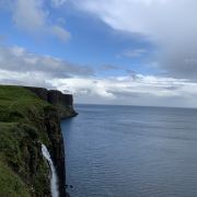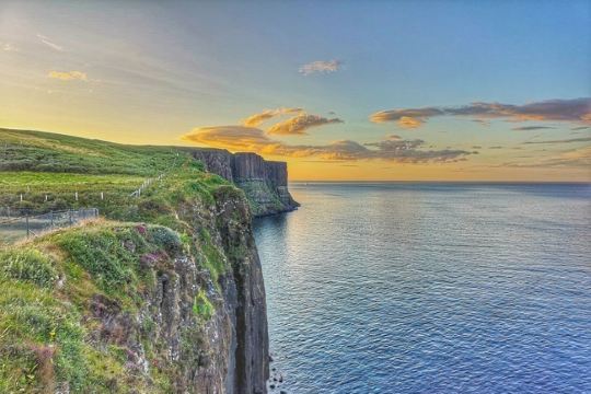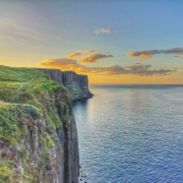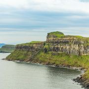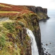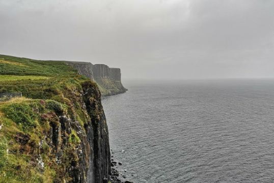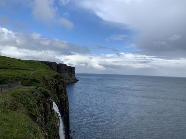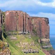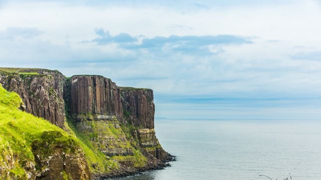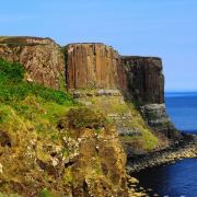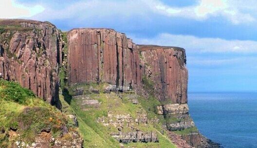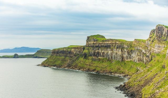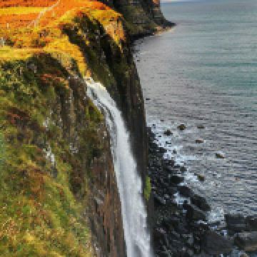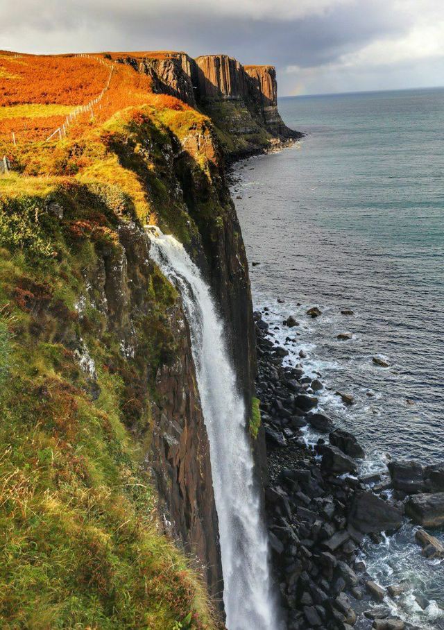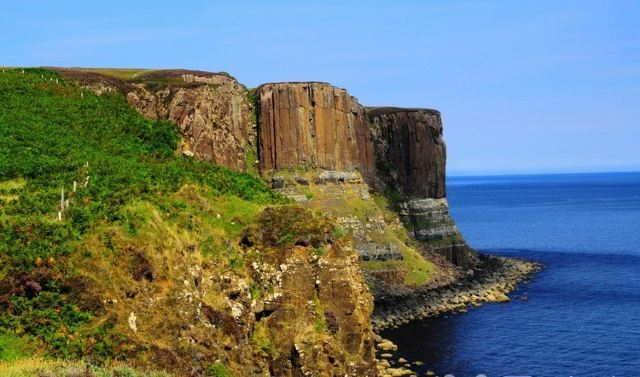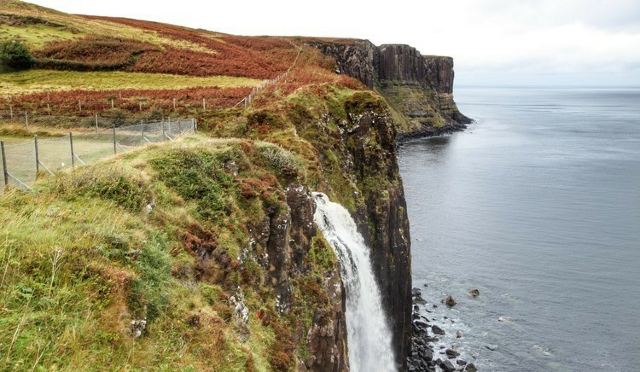 苏格兰裙岩悬崖因为外观如同一条苏格兰裙子而得名,位于Staffin镇附近的海岸。悬崖上有一条直接入海的瀑布,是苏格兰非常有名的景观,常常出现在风光明信片上,也很适合拍照。冬去春来或者夏天雨水较多的季节瀑布水流较大,夏天悬崖周围开满野花,拍出的照片更加好看。需要注意的是,要从侧面看才能看到瀑布的全貌。