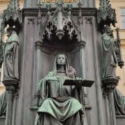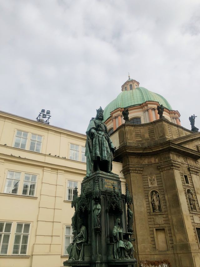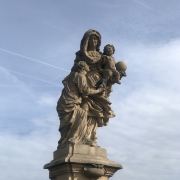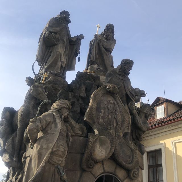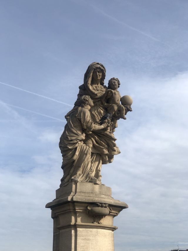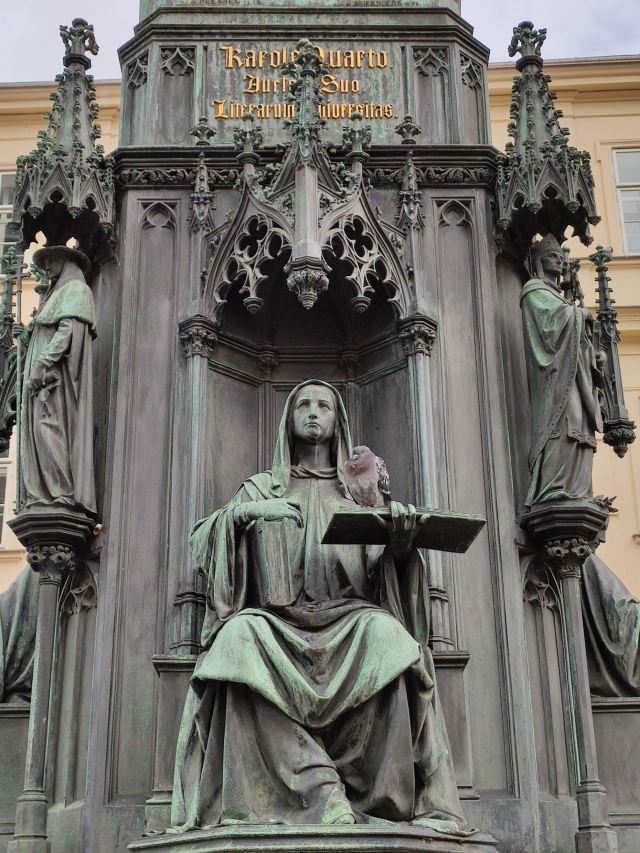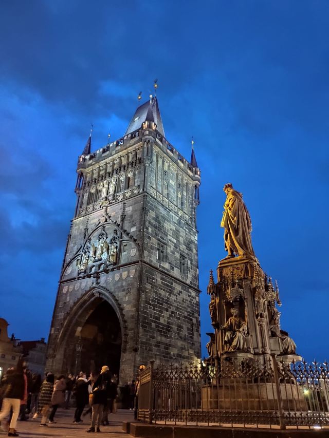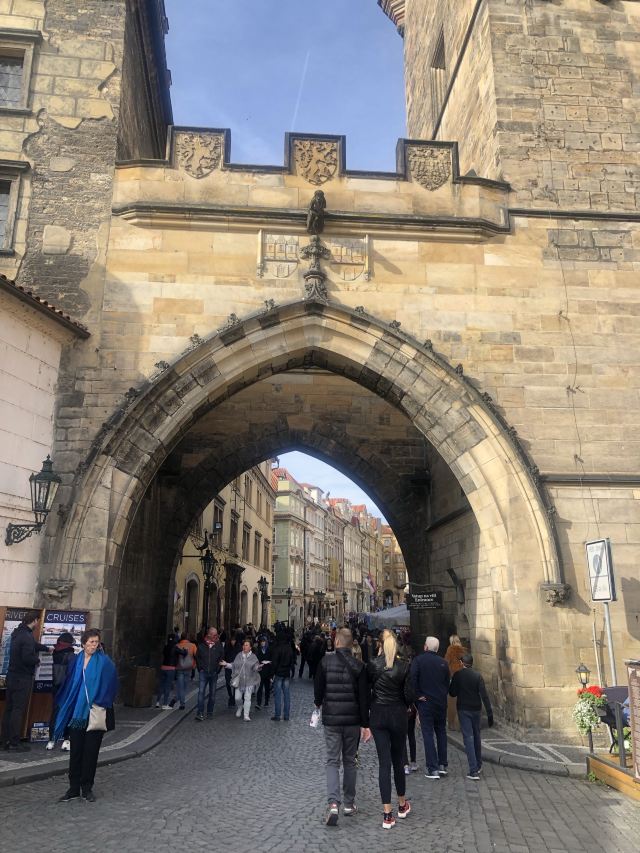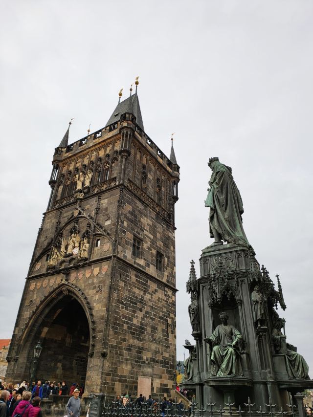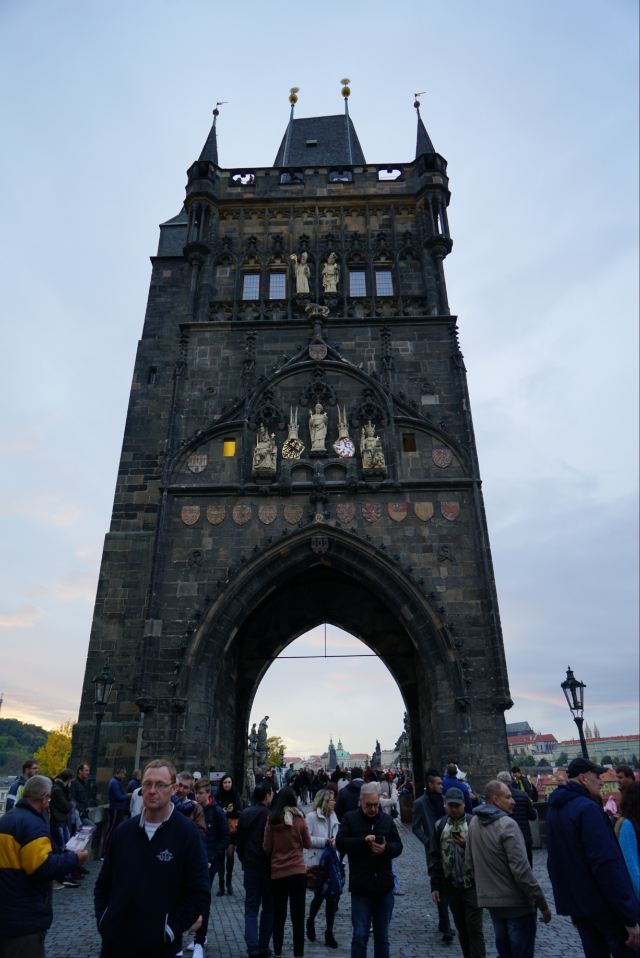 昨晚有幸欣赏了查理大桥霞光满天、飞鸟掠过、桥塔与雕塑形成完美剪影的迷人夜景,今天特意赶在中午时分再次与之相遇,细细品味不同时光下异样的味道。仔细望去,黝黑的桥塔东侧墙上夺人眼球雕刻有8尊栩栩如生的雕像,最上方左侧是布拉格第二任主教圣阿达尔贝特(Sv. Vojtěch,957-997),右侧是查理四世的儿子西吉斯蒙德(Zikmund,1368-1437),下方的狮子象征波西米亚王国。再下方雕塑左边是查理四世,中间是波西米亚主保圣人圣维特(Svat Vít),最右侧为瓦茨拉夫四世(Václav IV,1361-1419),还有两个盾徽和王冠,黑鹰代表神圣罗马帝国,双尾狮代表波西米亚王国。今天看到的这些布拉格辉煌时代的印迹其实都是复制品,真迹已于1972年被移至博物馆保存了。桥塔西侧没有雕塑,门洞上方刻有1648年“三十年战争”结束时达成的和平协议,对历史感兴趣的朋友可以自己百度了解一下。
