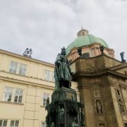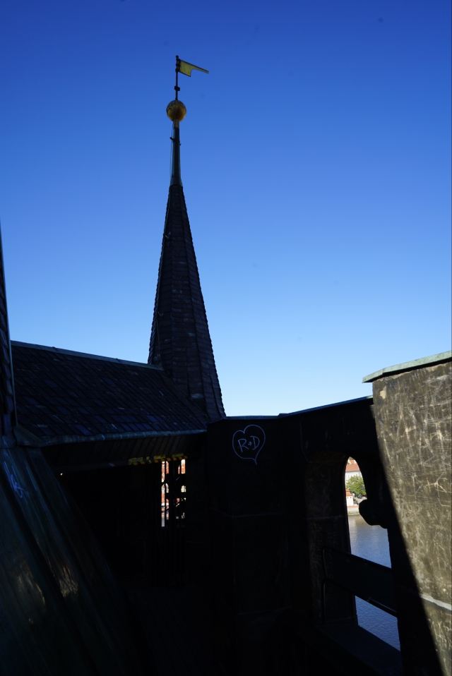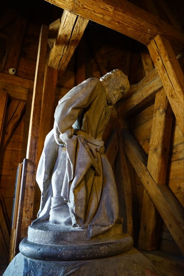 高耸坚固的桥塔不仅起到了防御瞭望的作用,还曾一度被用作监狱使用。因为时间充裕,8个欧元买票登塔去俯瞰整个查理大桥和老城区。顺着盘旋而上仅容两人擦肩而过的138级石阶,经过一个怪怪的据说是守塔人的石像,就到达了坐落于18米高处顶楼的观景台。豁然开朗的视野,的确是欣赏布拉格的不二之选之地,在这里远眺雄伟的布拉格城堡,近观宽阔的伏尔塔瓦河,看查理大桥上人来人往和老城的黄墙红瓦。二楼的查理大桥石雕知识展厅和地下室的实物文物展览都含在登塔的门票里,有时间一定要去看一下。