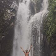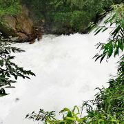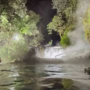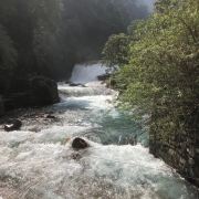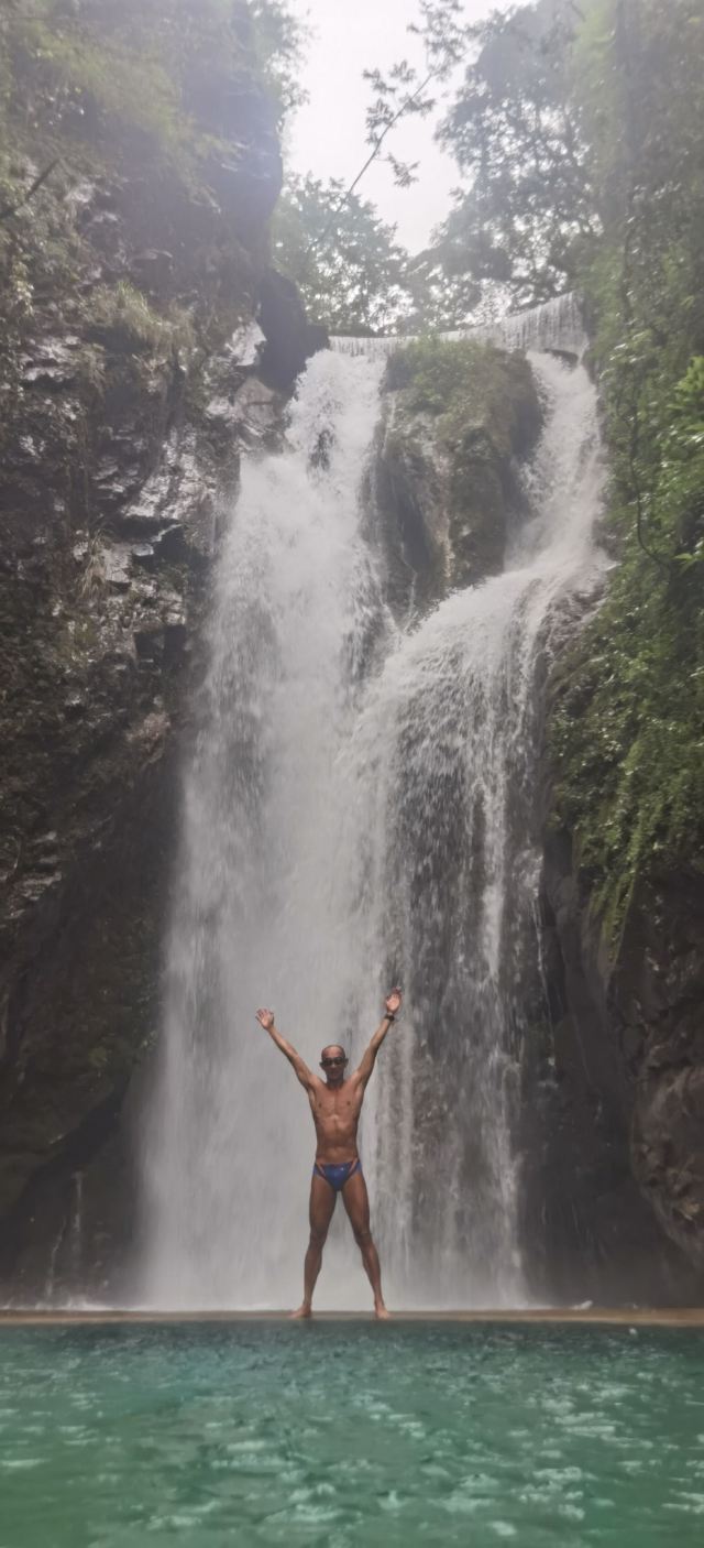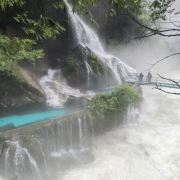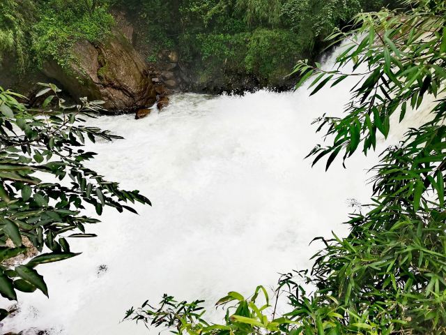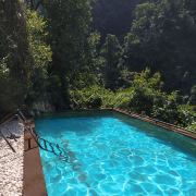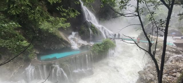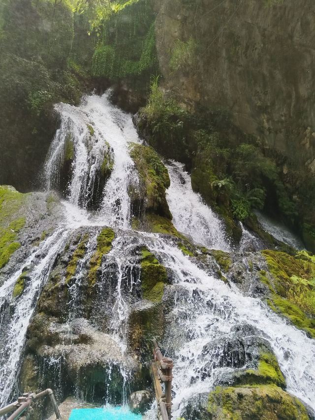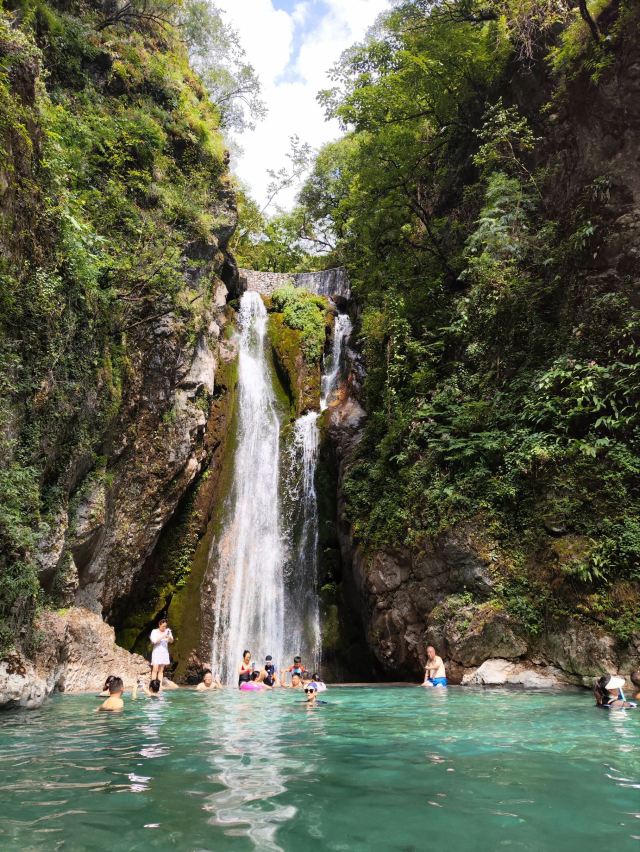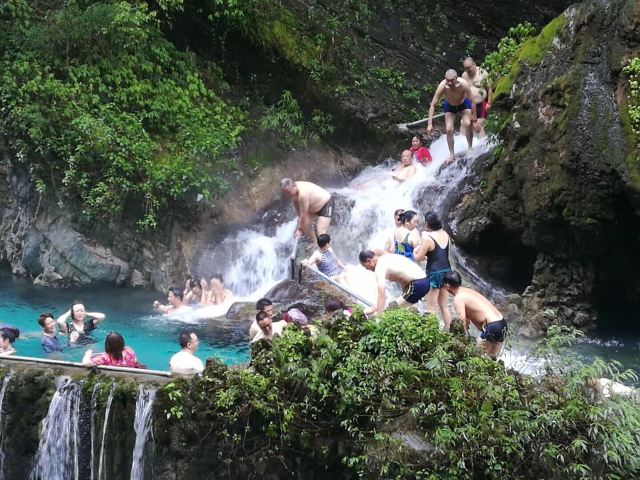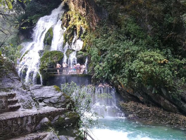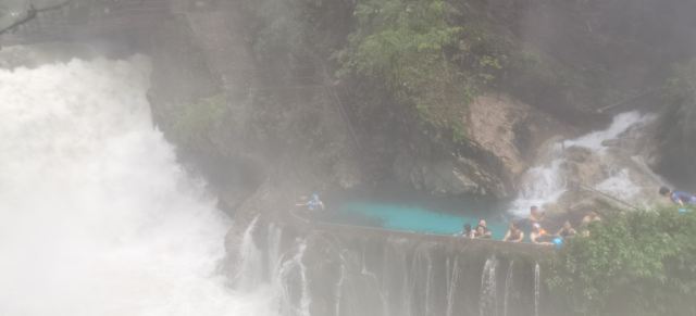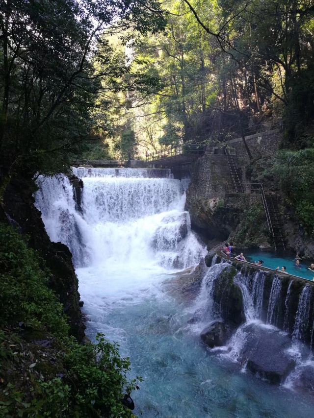这个池子在景区的最里面,大约要走10分钟左右,是设在瀑布下的一个温泉游泳池。奔腾的瀑布下面,清澈的池水,游多少次都不为过。