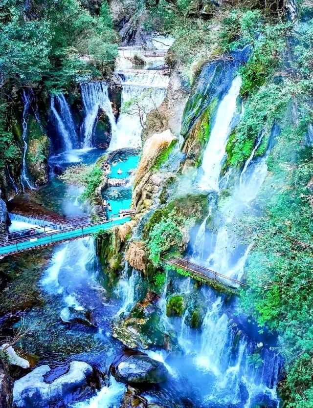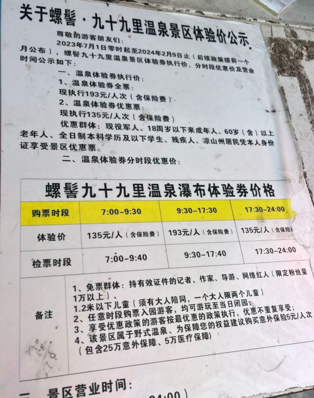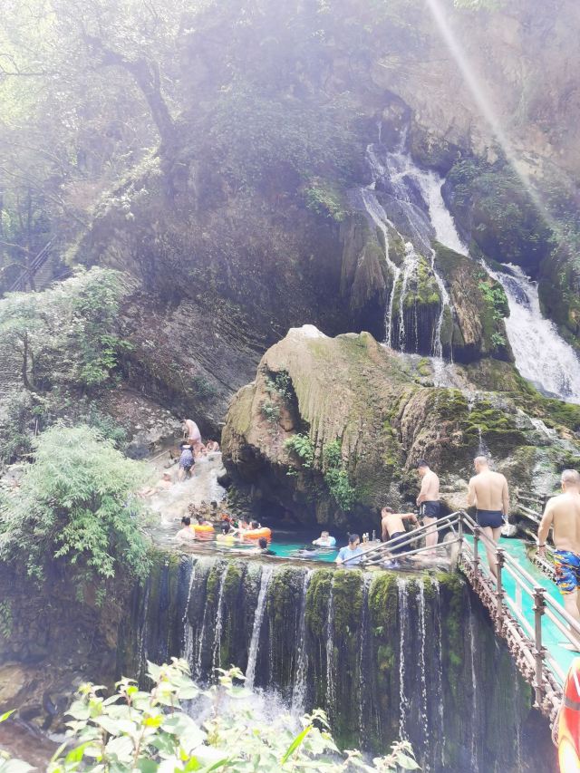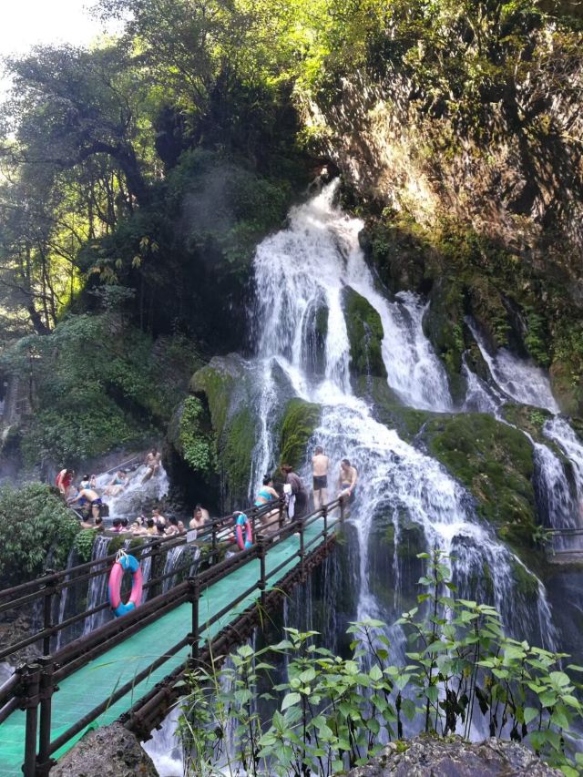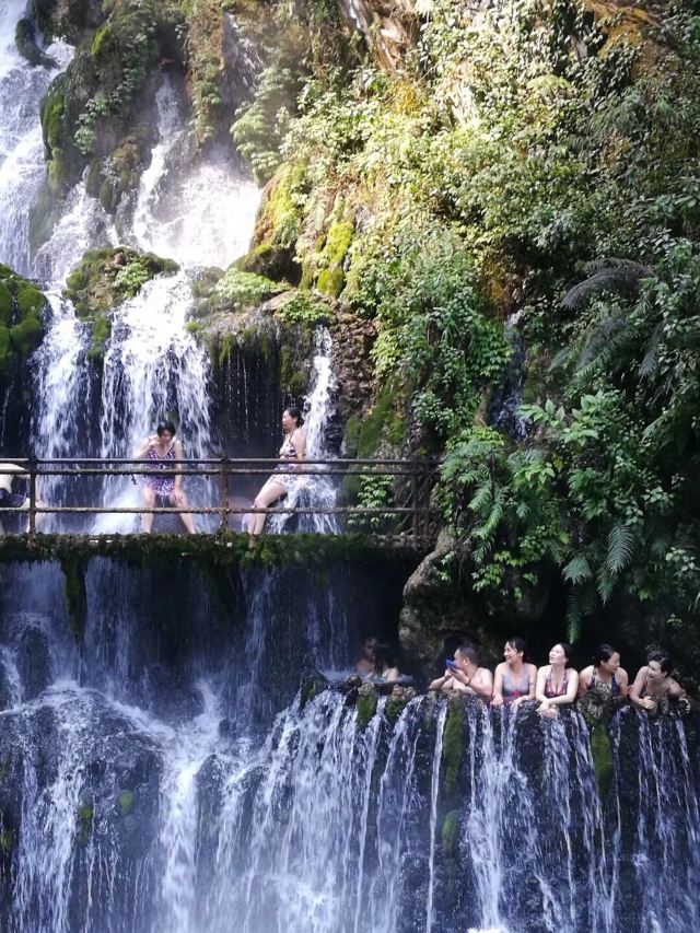 5分 超棒看网上评价有好有坏,心里也打了鼓,不过对于旅行而言,每个人的感受都不同,我想去了如果后悔也甘心了,但不去肯定会后悔很久的,事实证明我的选择是对的,到了之后还是很震撼的,螺髻山九十九里温泉,是世界上最大温泉瀑布、世界仅有的温泉群岛、世界仅有的悬崖温泉。温泉常年水温在40度左右,温泉水从半山悬崖上飞泻而下,其中最高一个瀑布落差达50多米……十分壮观。是一个温泉、景区二合一的自然景观,养生又养眼,孩子玩得都舍不得走了[呲牙][呲牙]如果说有什么BUG,那就是更衣环境有点差,但是真温泉好像更衣条件都不是很好,这里环保做的很好,沐浴不可以用洗护用品,个人觉得这点非常好,充分证明温泉的天热。另外门口明码标价,泳衣30元,这是我见过泳衣最便宜的地方,虽然我自己提前准备了。还有就是里面没有商业销售,也许我没找到,反正没有卖水卖吃的店铺,渴了有专门的长流水可以喝,上面标志着温泉水可饮用。出景区后,有餐饮农家菜馆。景区门口的农家大姐卖的水果也很便宜,蜂糖李和芒果都只要六元一斤,非常甜。