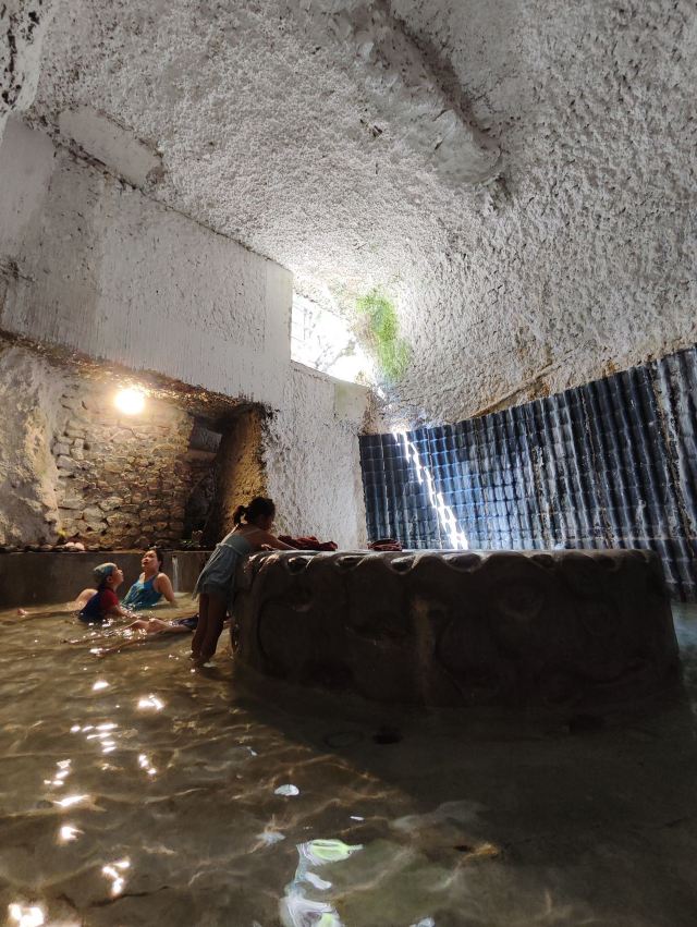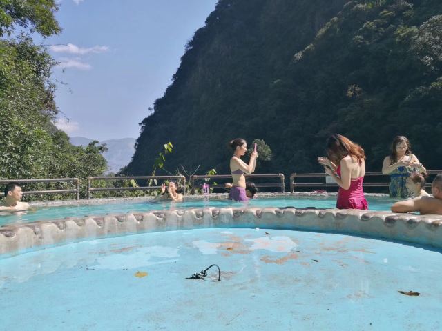 天然温泉水温都不太高晒到太阳或在溶洞里会暖和些主要挂衣区离泡池稍微有点远景区比较大泡池间隔的远浴袍湿了再穿就更冷了适合夏天来这里