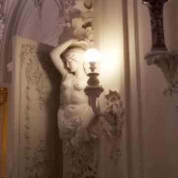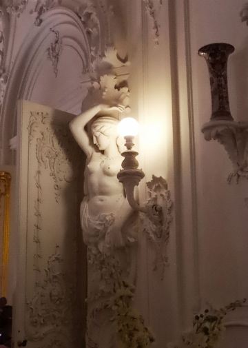 到了最关键的琥珀屋,这里管理就比较严格,肯定是不能拍的,管理人员会马上制止,我只能把相机挂在胸前随便按了几下。其实琥珀屋是个传说,据说是当年最神秘的一个宝物,在二战的时候整个宫殿都被破坏,纳粹把琥珀屋整个的拆掉搬走了,有传说放在藏宝洞里,很多电影也说这个的,现在这个琥珀屋是后期重建的,但也是由俄罗斯最好的能工巧匠造的,所以其豪华程度并不减当年呀。