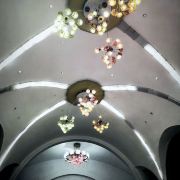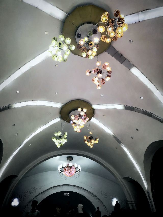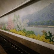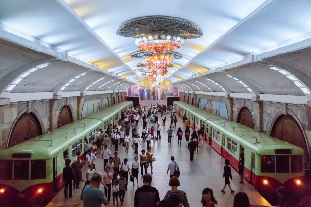 平壤地铁站台较大的特色是富丽堂皇的吊灯,以及两旁各有80米的镶嵌壁画。