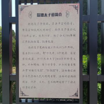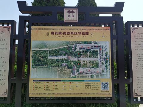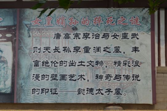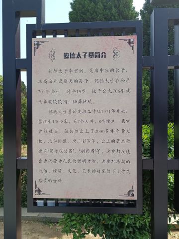 李重润的墓。位于乾陵东南隅,在今乾县城西北约3公里的乾陵乡韩家堡村北面。1971年发掘 。李重润于大足元年(701)与其妹永泰公主被武则天杖杀。神龙二年(706),中宗复位后陪葬乾陵,并号墓为陵。该墓地表有双层封土,呈覆斗形,南北长56.7米.东西宽55米,高17.92米。整个陵园南北长256.6米,东西宽214.5米,陵园四角有夯土堆各一,南面有土阙一对。阙南有石狮一对,石人两对(一对只残留底座)。石华表一对(已残,倒塌后埋入土中)周围设围墙,南面有土阙、石狮、石小人、华表等。地下由斜坡墓道、6个过洞、7个天井、四对小龛、前后甬道和方形前后砖室组成。全长100.8米。葬具置于后室,为庑殿式石椁,外壁雕饰头戴凤冠的女官线刻图,墓壁满绘壁画,保留约40幅。墓道两壁以楼阙城墙为背景绘太子出行仪仗,过洞绘驯豹、架鹰、宫女、内侍等。第一、二天井绘列戟,为天子之制。甬道及墓室壁面绘持物宫女、伎乐等宫廷生活画面。墓顶绘天象。该墓已遭盗掘,仍出土文物1000余件。有太子哀册、俑、三彩器和鎏金铜马饰等。