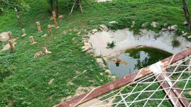 景区分为猛兽区和步行区。猛兽区内放养着老虎、狮子、狼、熊、豹等猛兽,园区内建有约一千米长的猛兽区-观光桥,蜿蜒架设于山谷之中,行走于五米高的观光桥上,你可俯视那些游走于山林草地间的猛兽,猛兽们捕食、争斗、休憩的场面一览无遗。