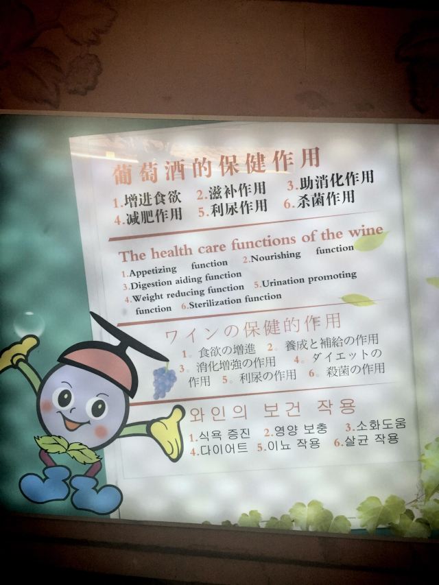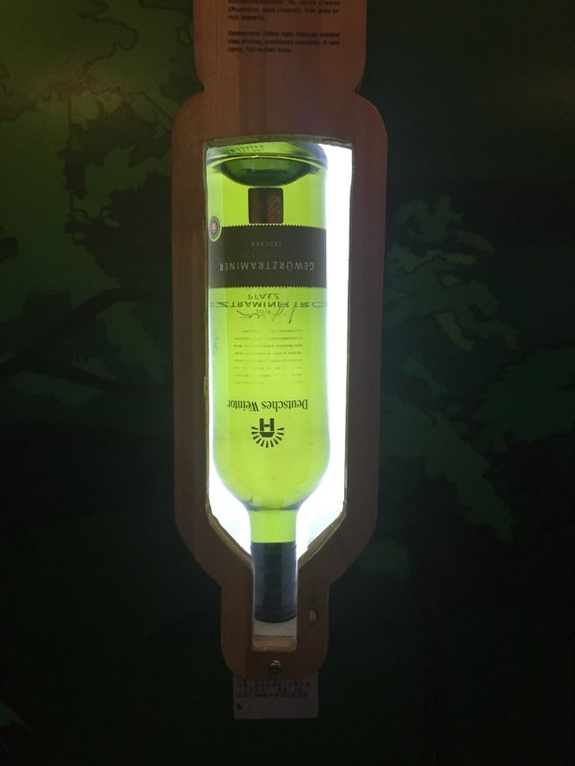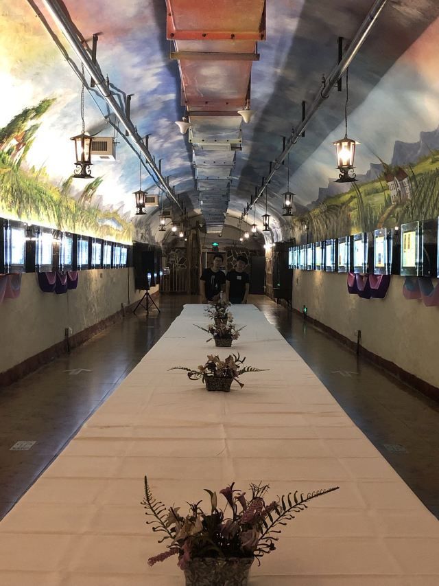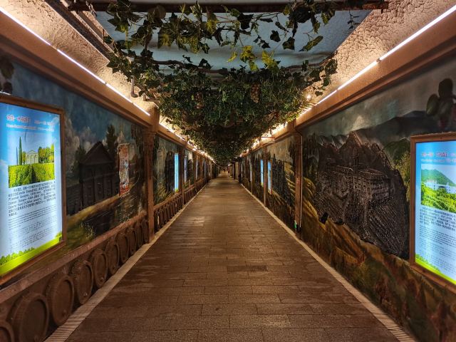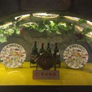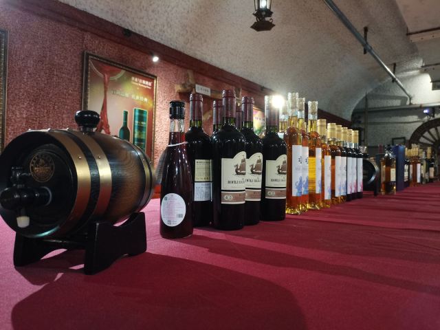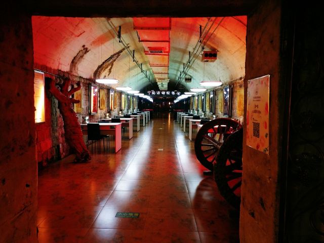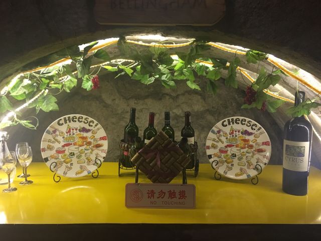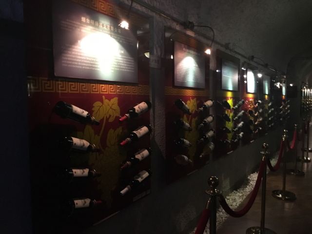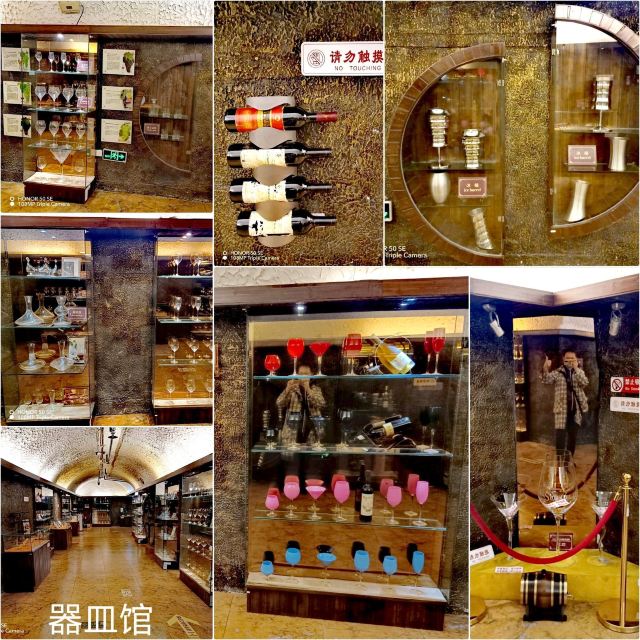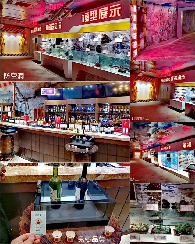 9、之后途经“酒鼻子”(葡萄酒中各种香味体验,种类很多,不过有的气味品种闻不到了)、纪念品超市(在此可免费品尝一小杯红酒,我选的右边那瓶,味道不仅没有苦涩反而很甜)、模拟防空洞(里面像是放空教育展示基地,有生化服和各种国产武器模型)。