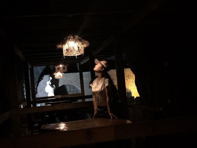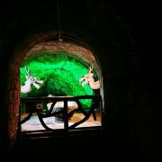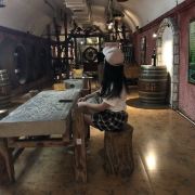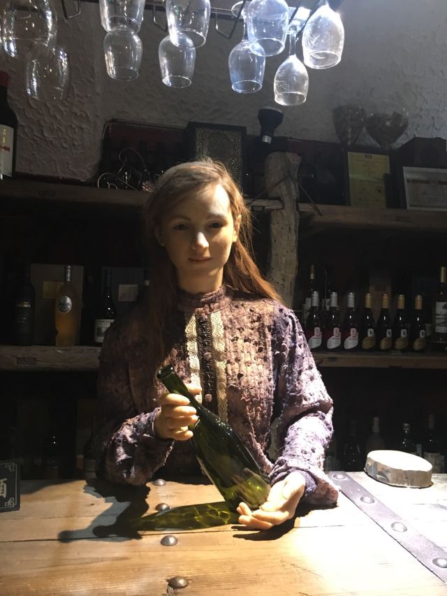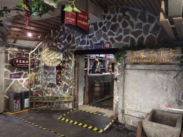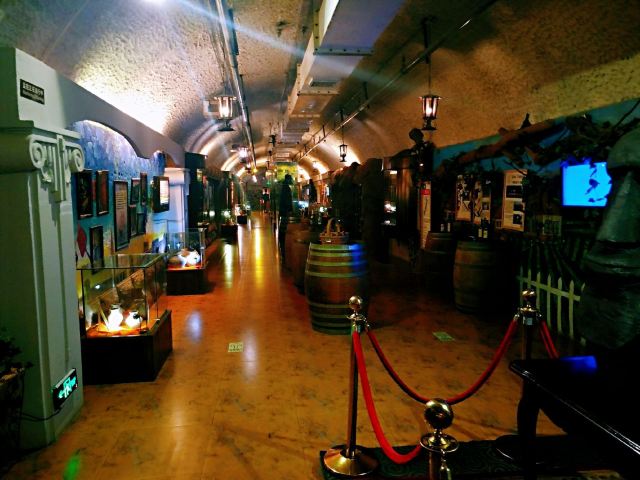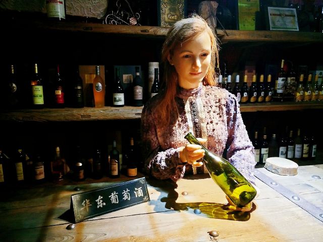 7、第六部分是“华东酒窖”,进门后的吧台服务员蜡像很精美,是拍照点。再往里走的布置像一个小酒馆,大木酒桶横横竖竖很有异域风格。