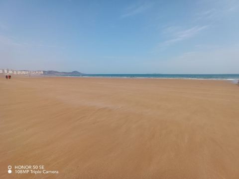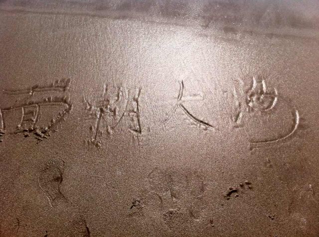 5、继续向东走就到金沙滩了,退去的海水将海滩打磨成一张天然宣纸,可供游人随意书写。比起市南区的海滩,金沙滩的沙子很细很柔软,杂质很少,带孩子来不太担心会划伤。