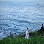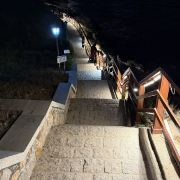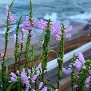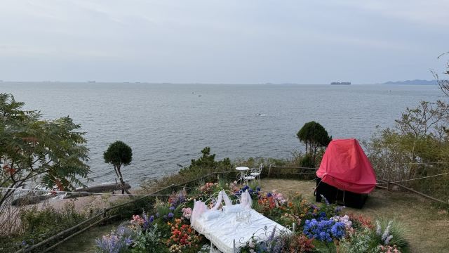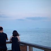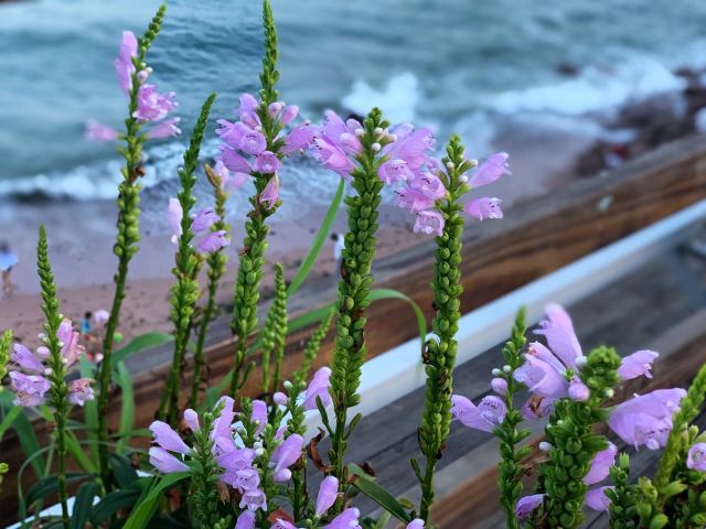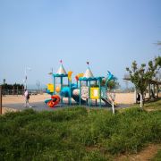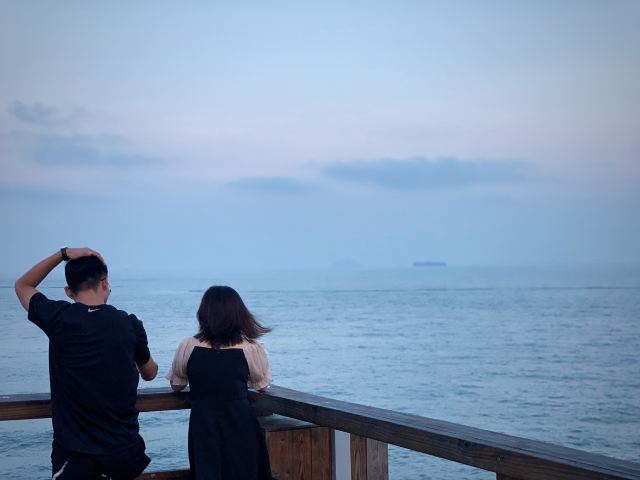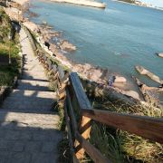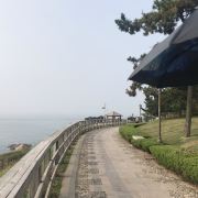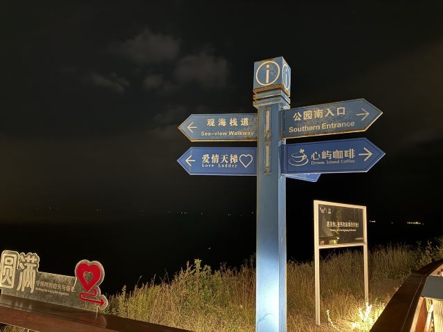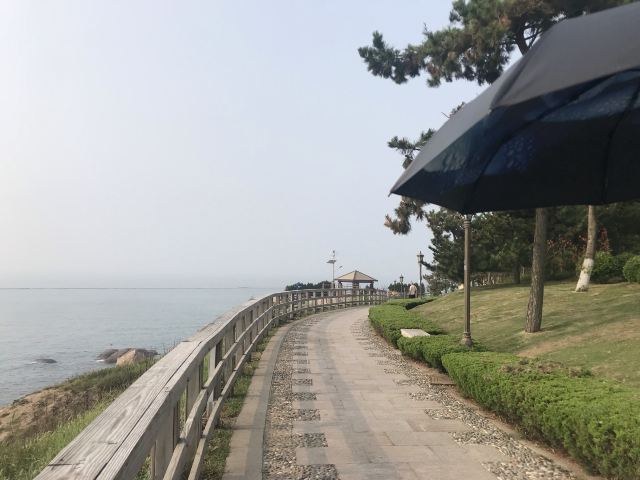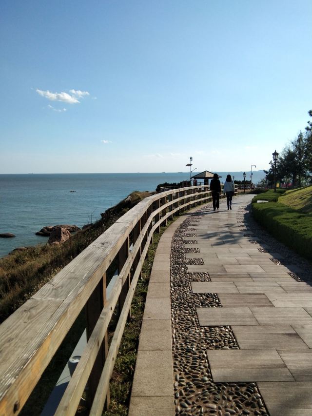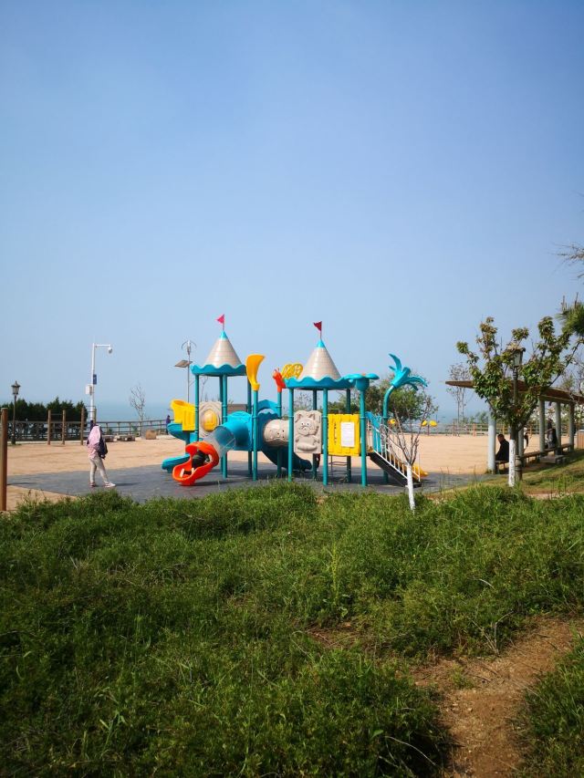 公园里的海滨栈道是一大亮点,木栈道与阶梯相连,一边是大海,一边是峭壁,峭壁底下鲜花盛开,在这里拍照仿佛置身于美丽的垦丁,有着独特的韵味。登上阶梯高处的平台放眼望去,可以将整个大海纳入眼帘,景色十分迷人。
