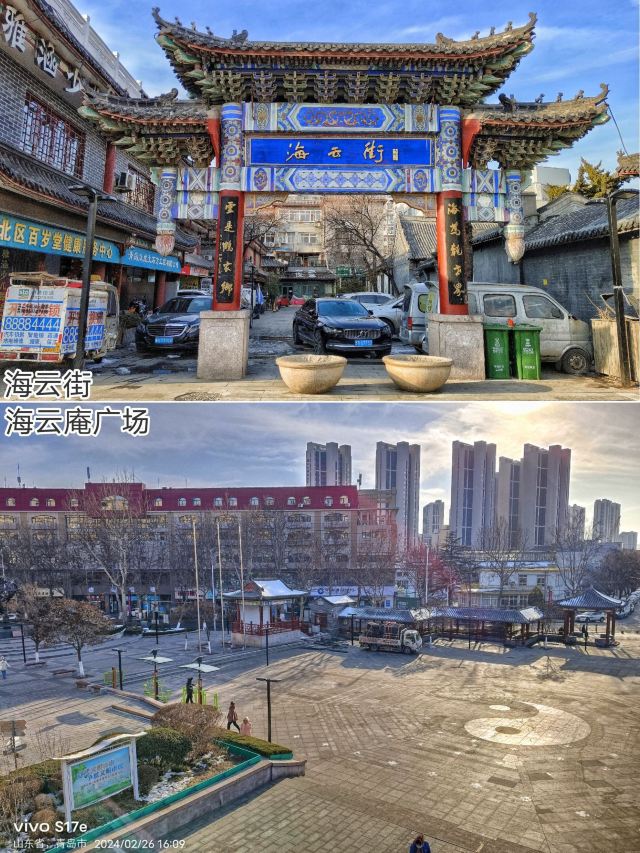 6、海云庵广场是海云庵门口外的小广场,广场正中是太极图案,西侧有亭廊可供休息。海云庵北侧墙外是海云街,街口的3洞大牌坊很壮观,海云街很短,只有几家普通商铺。
