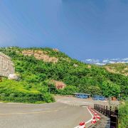 从山下购票后需要乘区间车走八公里的山路,之后进入山门。从这里至景区核心的环线区需要步行一段路程,则会看见一处“神龟背负河图、洛书”的巨大雕塑,这是中国远古人类的神话,诉说着中华古老文化的发源都源于河图、洛书。然后一路向上可以看到铁瓦殿旧址,这些高达百米的花岗岩石壁上刻有康熙二年的石刻。