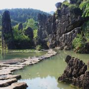 天星桥景区位于黄果树景区下游。景区分为天星盆景区、天星洞和水上石林区三大区,这里主要观赏石、树、水的美妙结合,是水上石林变化而成的天然景区。如果说黄果树景区的特点是气势磅礴,天星桥景区则是玲珑秀美。