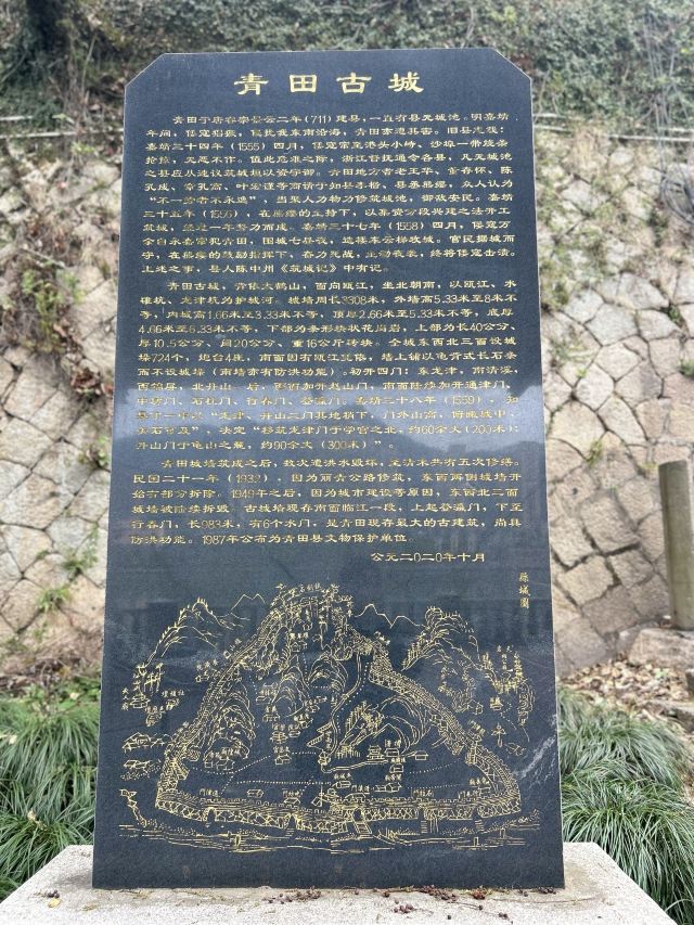 青田古城始建于明嘉靖三十五年,古城背依太鹤山、面朝瓯江,周长约3308米,设有城垛、炮台及护城河,初有东龙津、南清溪、北丹山等四门,后增开多门。后因洪水、城建拆毁部分城墙,现存南面临江段长约983米,含6个水门。1987 年它被列为青田县文物保护单位,至今仍具防洪功能,是青田现存较大的古建筑。