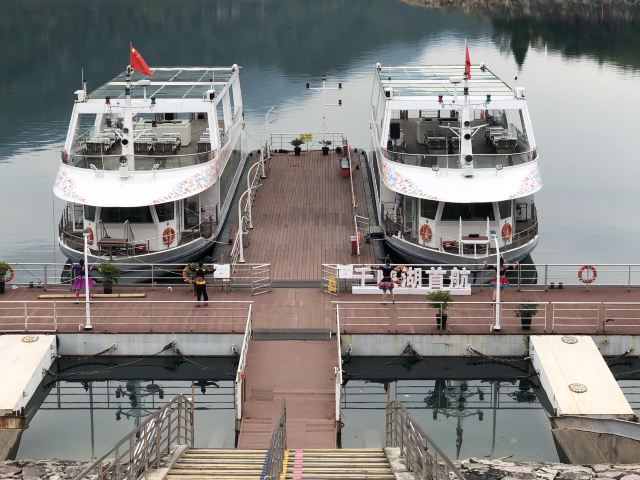 千峡湖生态旅游度假区位于浙江省丽水市青田县,因群山围绕蜿蜒修长的碧波湖面形成1009座美丽峡湾而得名,这里森林覆盖率高达90%,负氧离子的平均浓度达到每立方厘米6000个。“九山半水半分田”的地貌、群山环抱的自然格局,赋予了千峡湖生态旅游度假区山水田园般的诗情画意。“峡湾游”游船的船身为白色,整体风格时尚极具美感,船身长35米,型宽7米,型深2.5米,多可承载150名游客。船体共有2层,一层船舱为恒温休息区,可在舒适的皮质座椅中观看电视大屏播放的千峡环湖风光、尽享落地玻璃窗外烟波浩渺的湖面、峡湾、倾听语音导览讲解刘伯温传奇等当地人文历史故事,船体二层为开放空间,是游客欣赏千峡湖生态旅游度假区秀美风景、感受峡湾风情的上佳观景平台。