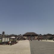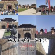 景区主要的景点就是四海归一殿,分前殿、中殿、后殿,纵深长达120多米,威严矗立,高耸挺拔,是秦王上朝理政的地方。这里曾经是张艺谋影片《英雄》和香港热播剧《寻秦记》的拍摄地点,如今游客可以穿上戏服,坐上王座拍照(需付费)。殿中央被景区改造成巨大的许愿池,里面金光闪闪着许多游客投进去的硬币。殿前的九十九级台阶,每天都有演员上演始皇登基的巡游表演。