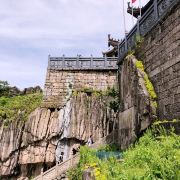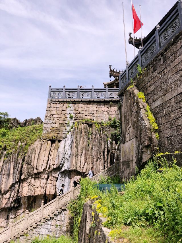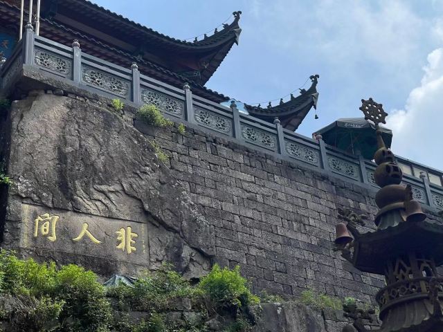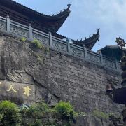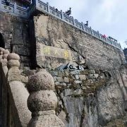 从寺后小门可到天台顶处——云峡。二块巨大岩石之间,只能容一人通行,右边岩石上直镌“云峡”二字,左边岩石横刻“三线天”三字。这里是九华山看日出、观云海的好地方,天气晴朗时,可以俯瞰九华群峰和山下的九华街。