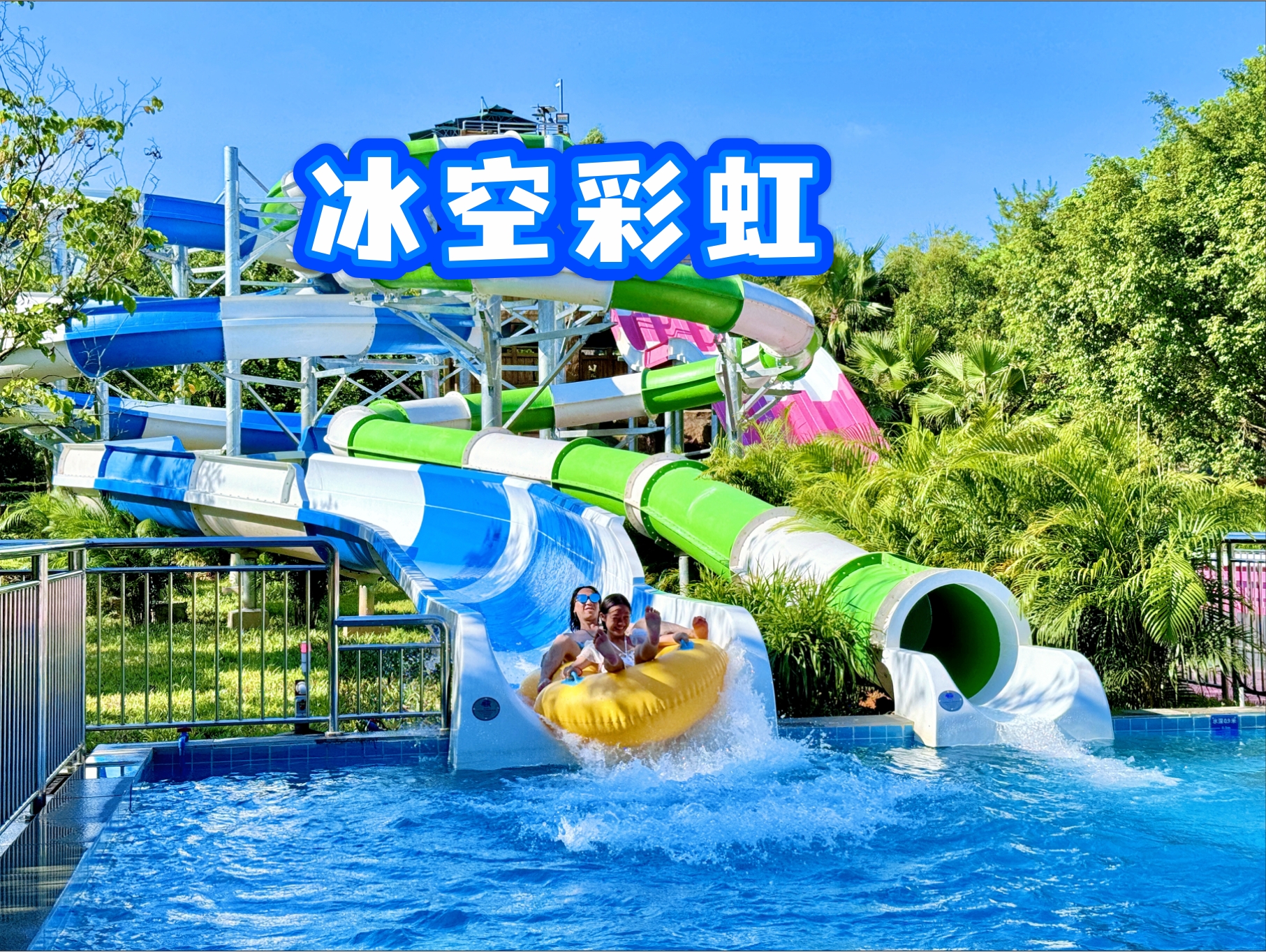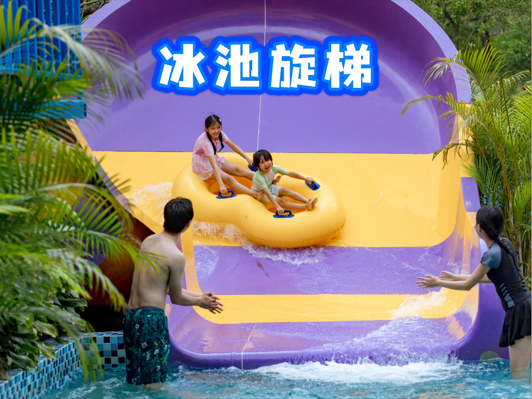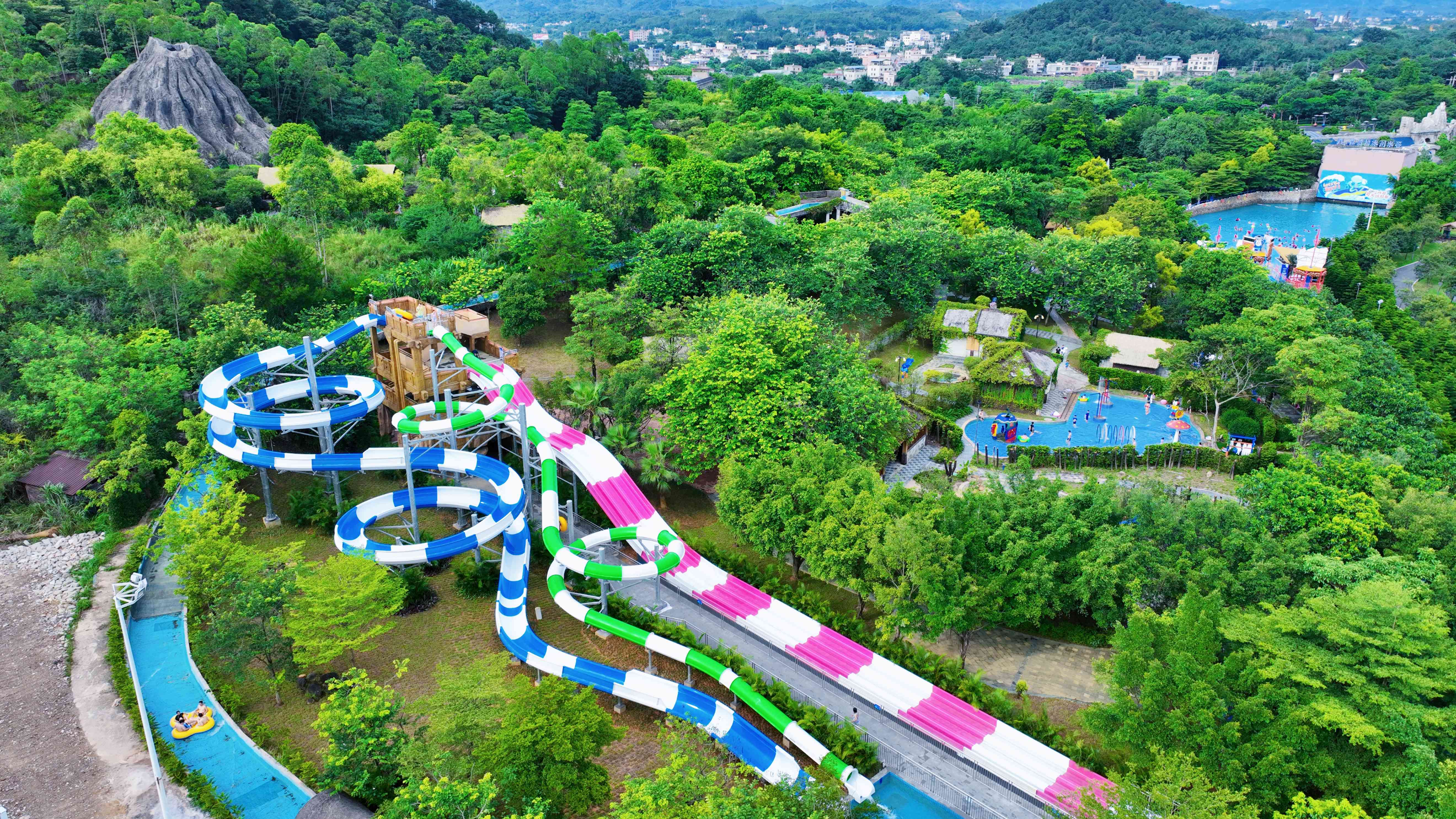 由3组竞赛滑梯,2组旋转滑梯组合而成,自由落体式滑水道,可以从18米高处以时速60公里速度俯冲直下带给游客难以置信的高空滑翔快感。