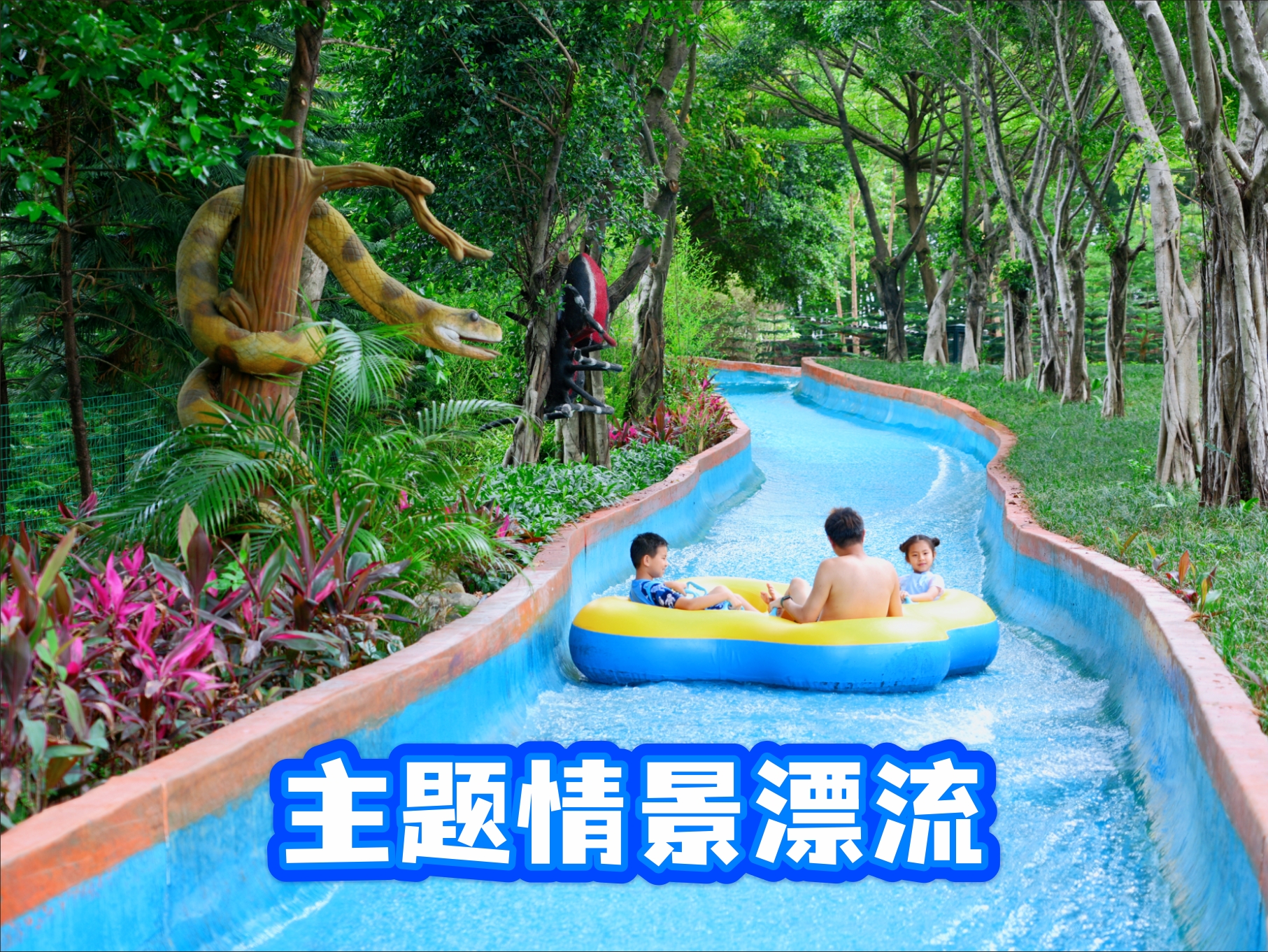升级的“冰河历险情景漂流”,全长1500米、高差近30米,犹如一条绿色飘带,一路穿越冰川遗址风情、“蛮荒高原”、亚马逊丛林秘境,沿途恐龙卫士保驾护航、恐龙乐团唱响清凉、喷水雷龙戏水狂欢,还有巨蟒、蜘蛛、青蛙出没,而后在风情万种的紫藤花海长廊中穿梭而下,好一段穿越时空的浪漫旅程。