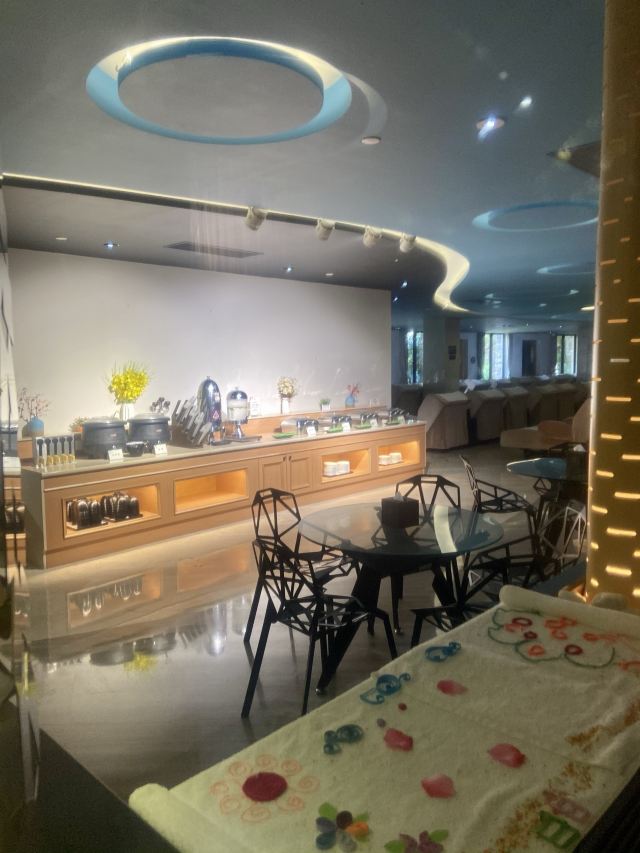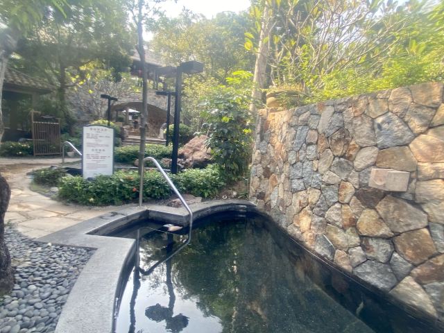 美林湖温泉的门面不算很大,下了楼梯之后却别有洞天,先进去更衣室换好泳衣、冲身、披上毛巾就可以去玩了。