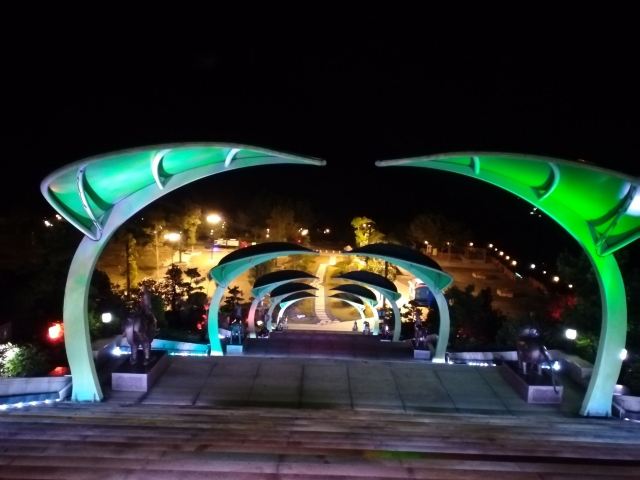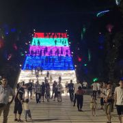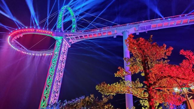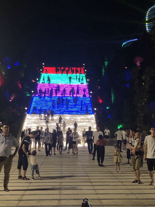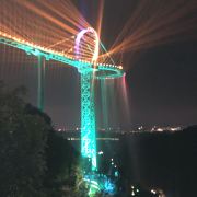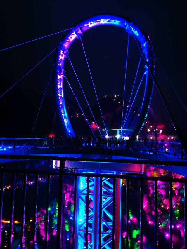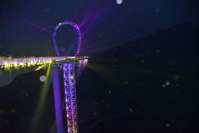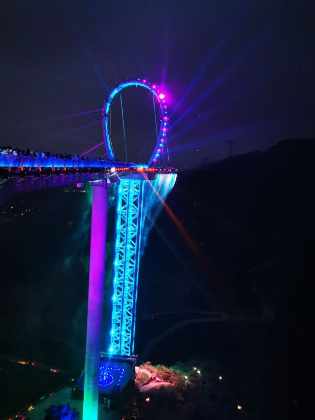 除此以外,悬廊设计团队充分发挥创意能力,在500米高空的环形悬廊上安装了音乐灯光水瀑系统,形成了总周长达168米的环形音乐瀑布,不仅在白天给游客带来“飞流直下三千尺”的震憾感受,亦能让游客观赏到阳光斜照环形瀑布时形成的空中彩虹,更能在夜幕降临之际随着环形音乐瀑布的灯光开启,2000多只炫丽灯具的动态表演汇成了精彩的灯光盛宴。夜间悬廊灯光的交相辉映,让整个景区变成如梦如幻的世界,也带给游客带来极其震撼的视觉享受。