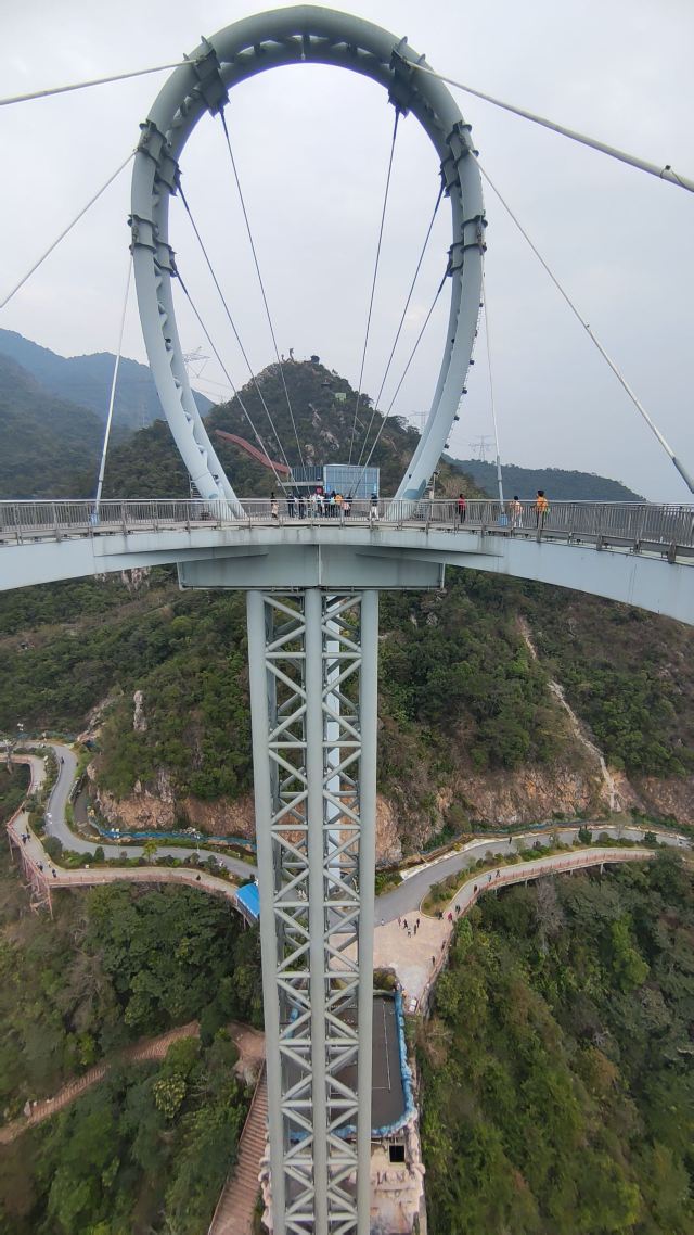 它由三个钢混结构的巨型立柱支撑,外观如同球拍交叉立于高山之上,直指云天,被广大游客形象地称为“大球拍”。