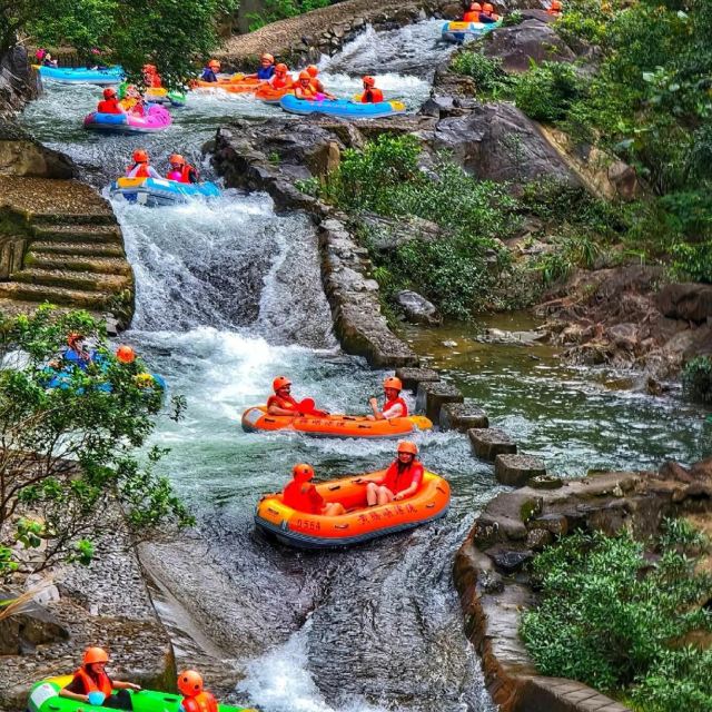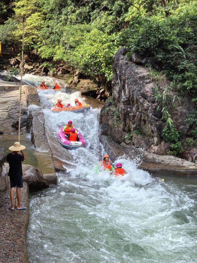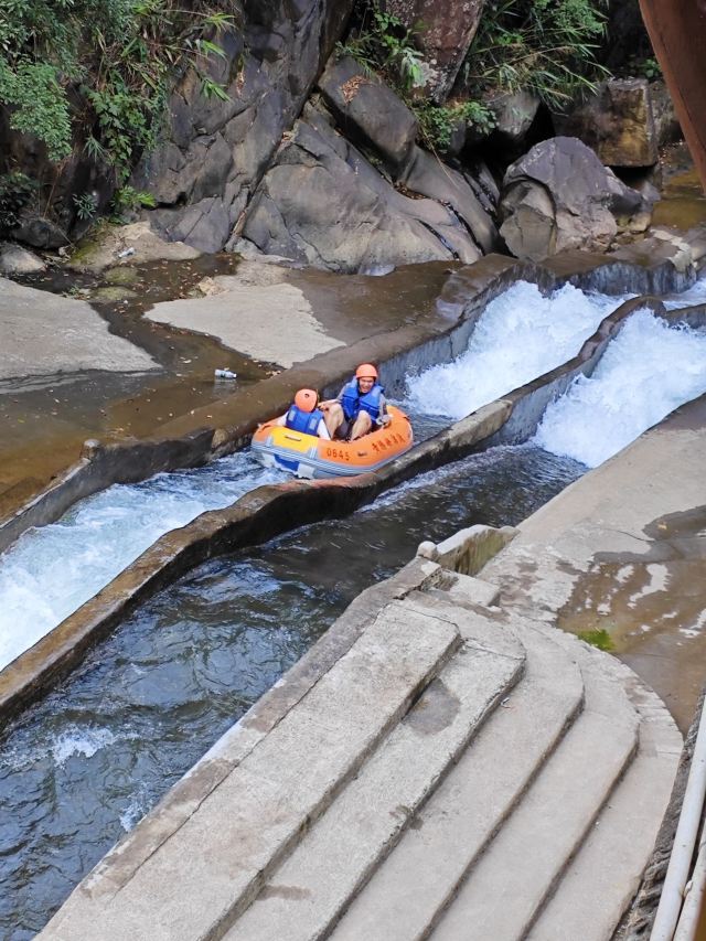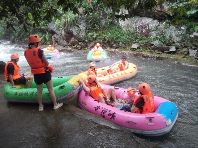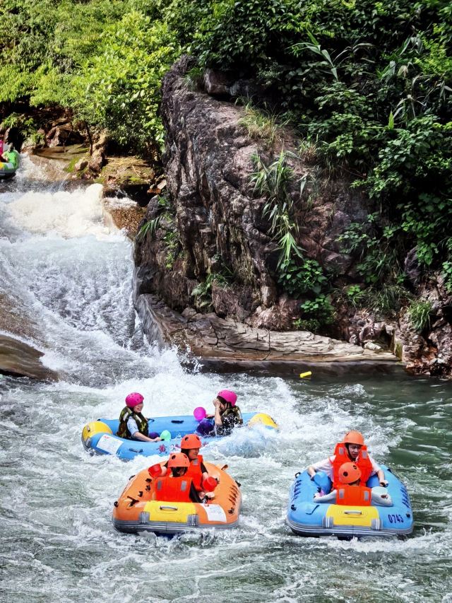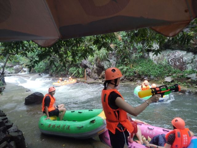 全程勇猛漂,漂流河道全程漂段,漂时约150分钟,游客若觉得猛士漂或勇士漂还不过瘾的话,可以选择全程勇猛漂,体验漂流的刺激挑战。大小落差有130多处,既可感受澎湃刺激而安全的漂流,又能在自然生态的水域中享受优良水质的清凉畅快,一路尖叫,感受漂流带来的乐趣。(提示1.3米以下55岁以上的游客请勿参与)