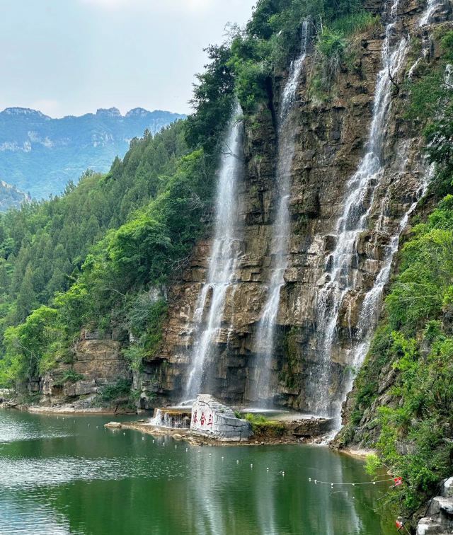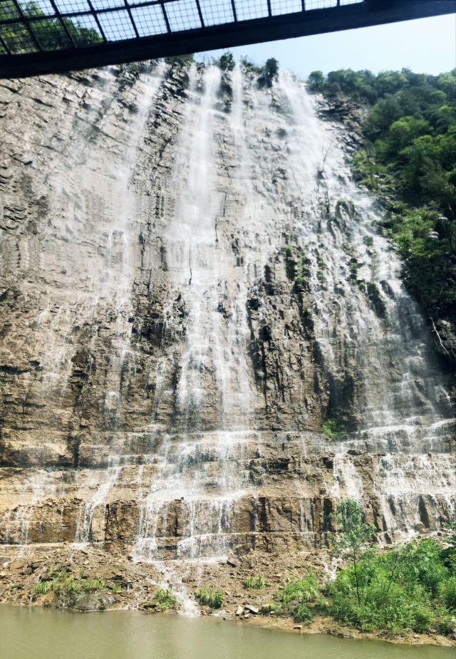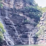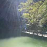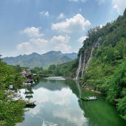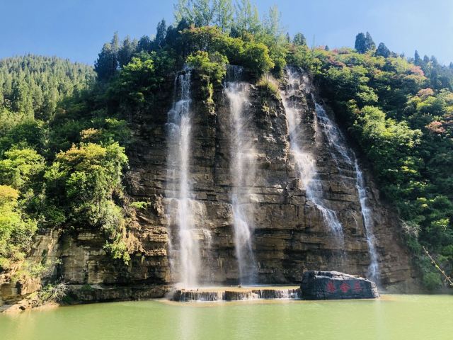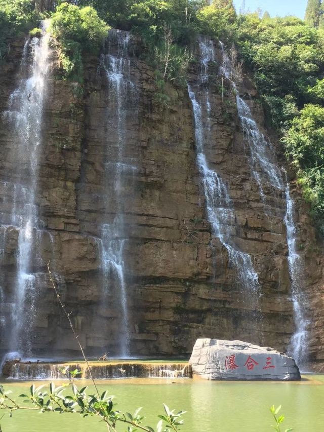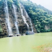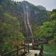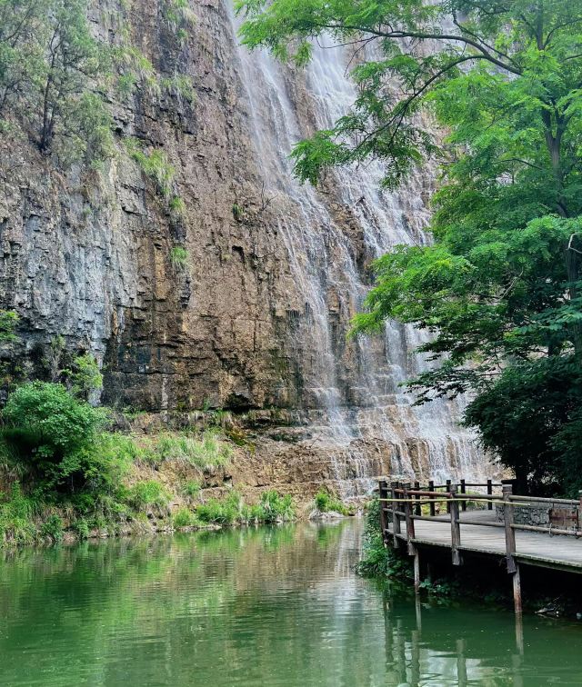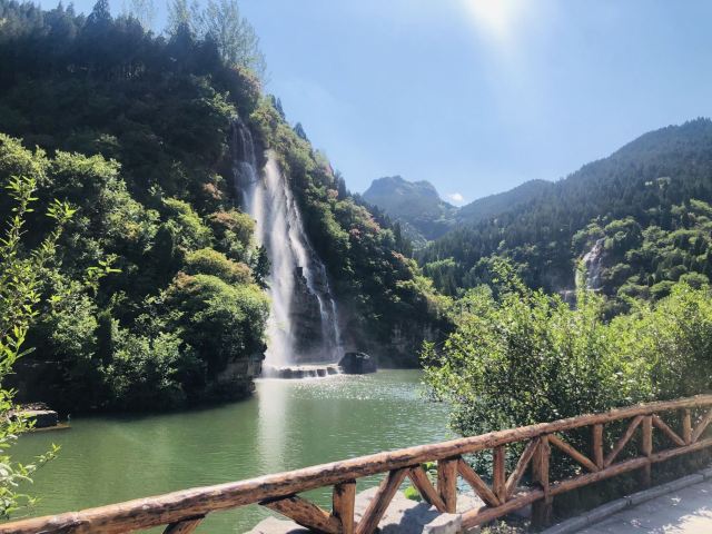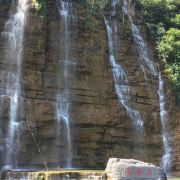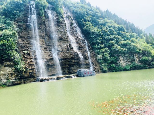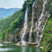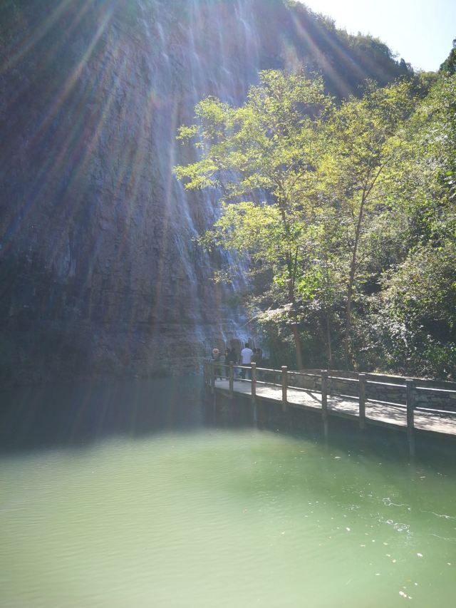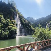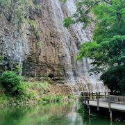 走进景区,就会有一泓瀑布映入眼帘,倾泻而下,沿着石壁,在绿植之间驰骋。穿过一处古色古香的连廊,你会来到一座吊桥前,尽头有一个两层重檐亭阁,在这里你可以眺望三瀑合流的美景。踩着石头过河,在河中间的石头上坐下,接触这山间水,感受来自大自然的清凉。潭的中央还建有一座木制小桥,越过小桥,便走进对面的一面瀑布,瀑布水流直下,在瀑布流过的山崖上凿一山洞,游人需从此穿过瀑布感觉很有意思。