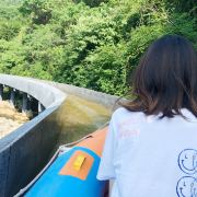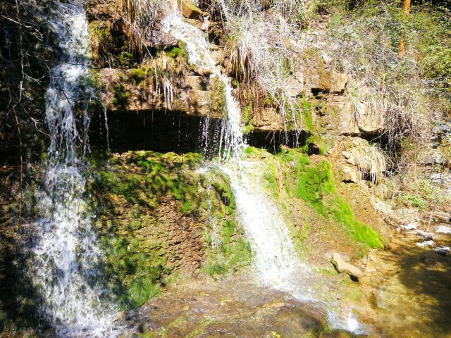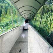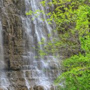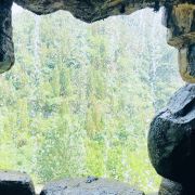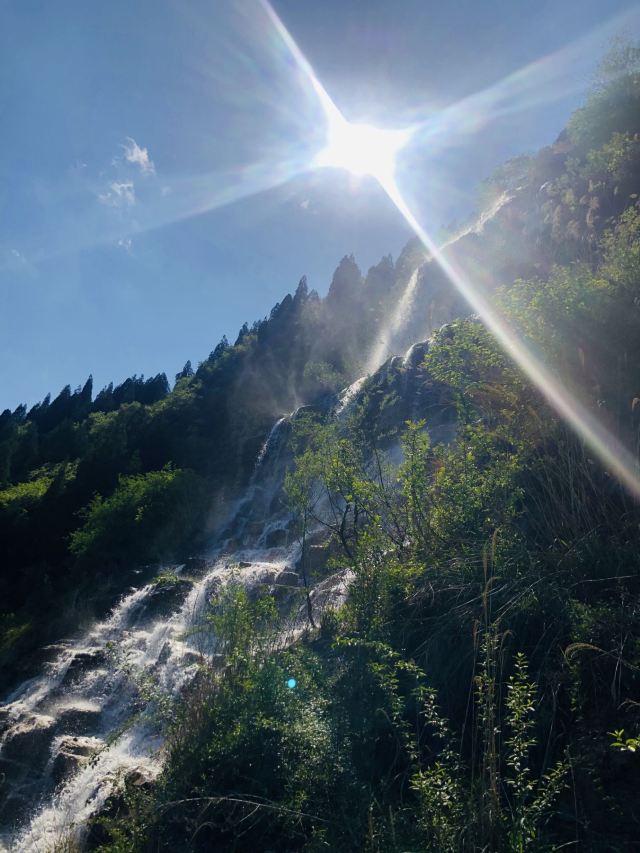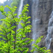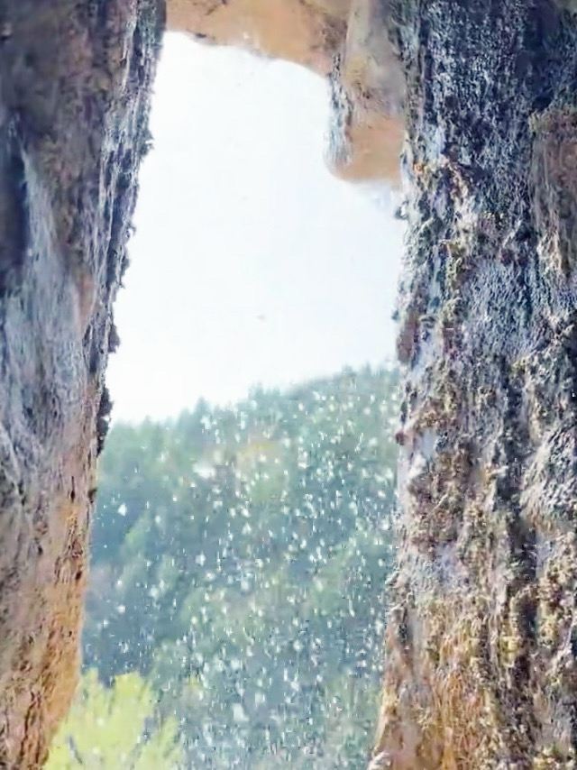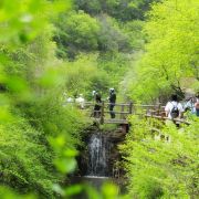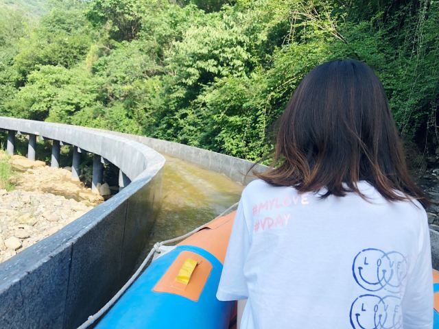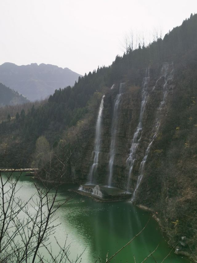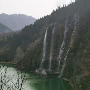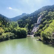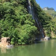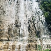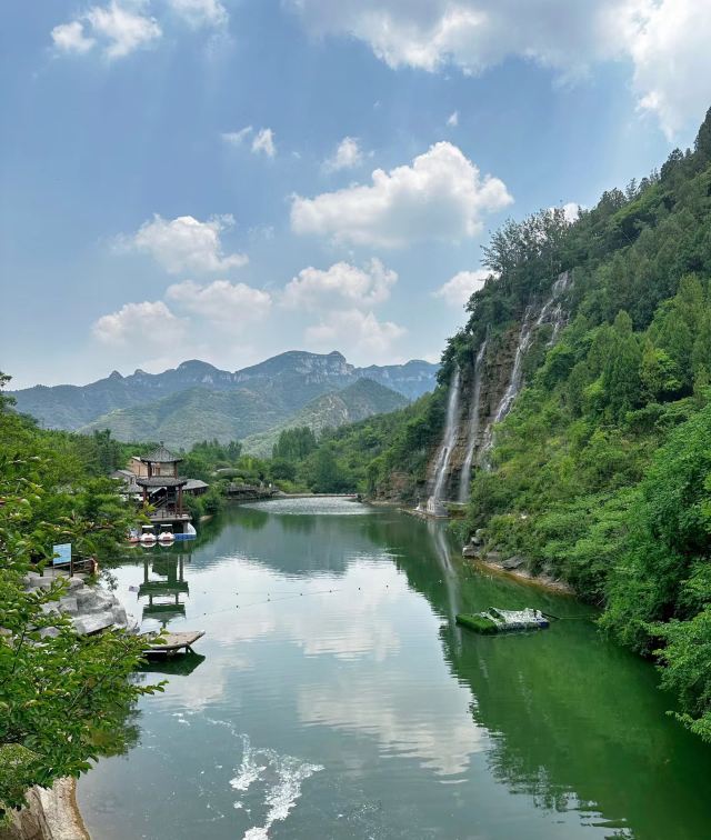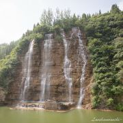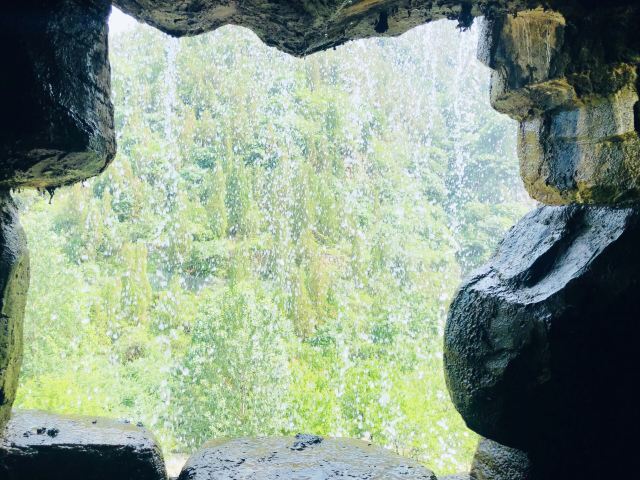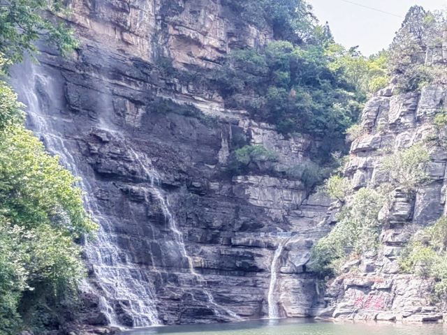 走进景区,就会有一泓瀑布映入眼帘,倾泻而下,沿着石壁,在绿植之间驰骋。穿过一处古色古香的连廊,你会来到一座吊桥前,尽头有一个两层重檐亭阁,在这里你可以眺望三瀑合流的美景。踩着石头过河,在河中间的石头上坐下,接触这山间水,感受来自大自然的清凉。潭的中央还建有一座木制小桥,越过小桥,便走进对面的一面瀑布,瀑布水流直下,在瀑布流过的山崖上凿一山洞,游人需从此穿过瀑布感觉很有意思。